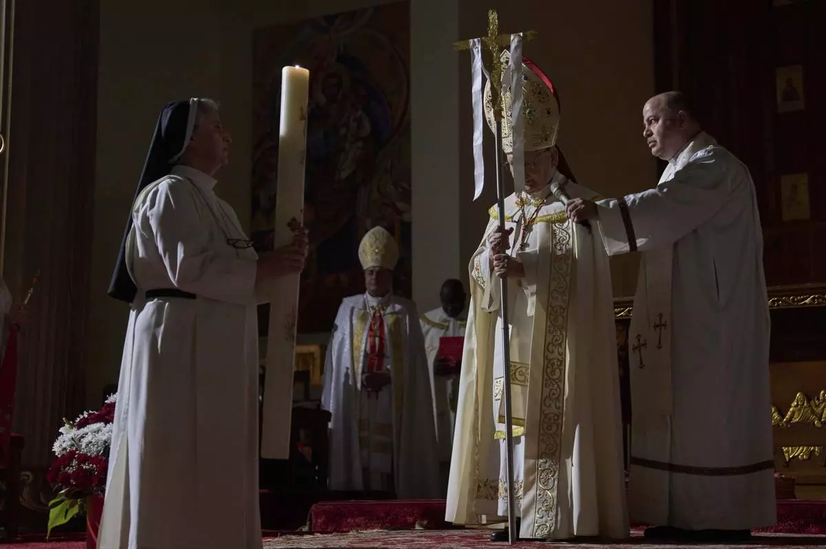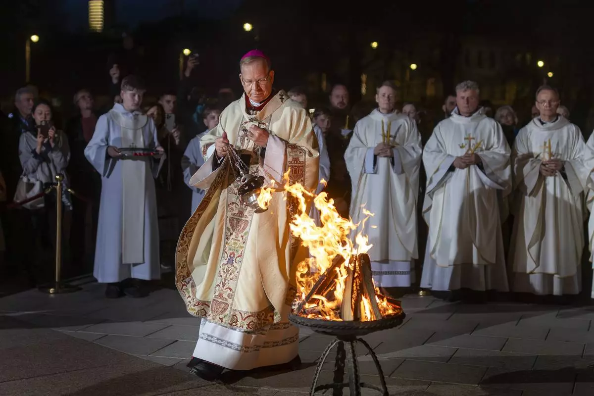Archbishop Gintaras Grusas performs the blessing during the Easter vigil Mass at the Cathedral in Vilnius, Lithuania, late Saturday, April 19, 2025. (AP Photo/Mindaugas Kulbis)