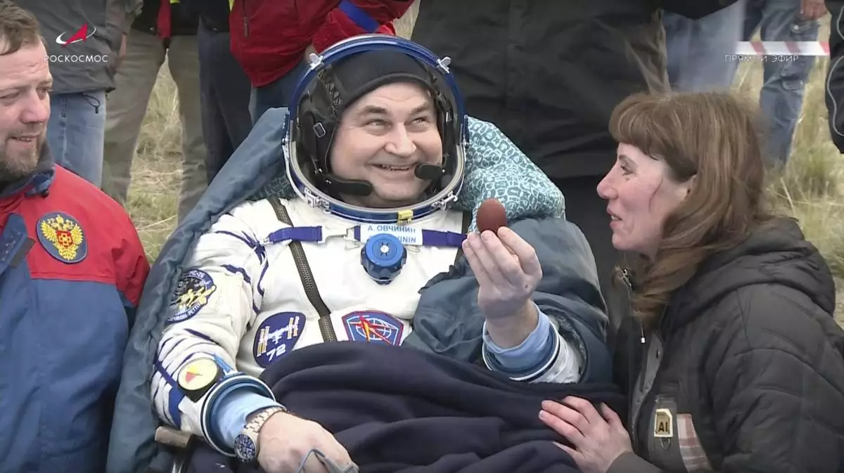 In this photo taken from video released by Roscosmos space corporation Roscosmos cosmonaut Alexey Ovchinin holds traditional Easter painted egg shortly after the landing of the Russian Soyuz MS-26 space capsule with Roscosmos cosmonaut Ivan Vagner and NASA astronaut Don Pettit, near Kazakh town of Zhezkazgan, Kazakhstan, Sunday, April 20, 2025. (Roscosmos space corporation via AP)