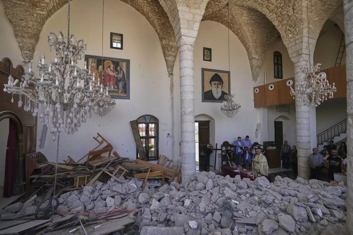 Worshippers gather for Easter Mass inside the ruins of St. George Melkite Catholic Church in Dardghaya, southern Lebanon, Sunday, April 20, 2025, after the church was heavily damaged in an Israeli airstrike earlier in the conflict. (AP Photo/Hassan Ammar)
