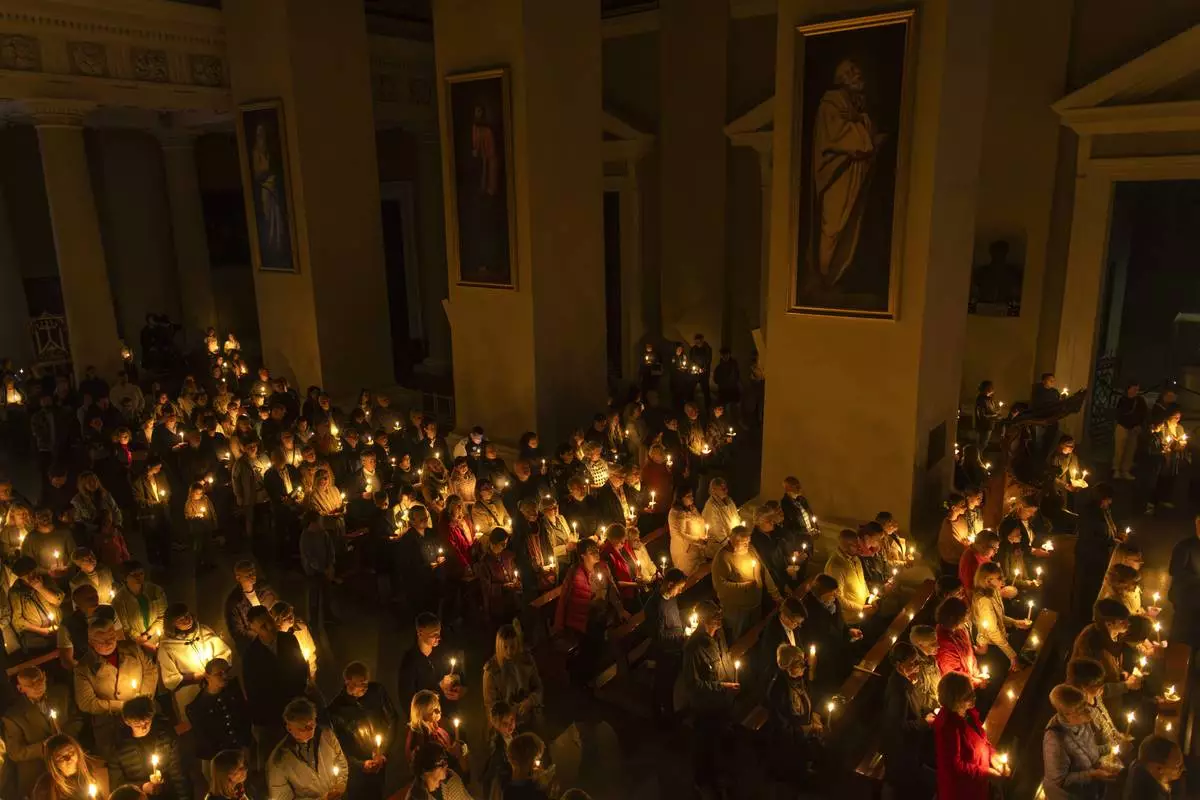 Worshippers hold candles during the Easter vigil Mass in the Cathedral Basilica of Vilnius, Lithuania, late Saturday, April 19, 2025. (AP Photo/Mindaugas Kulbis)