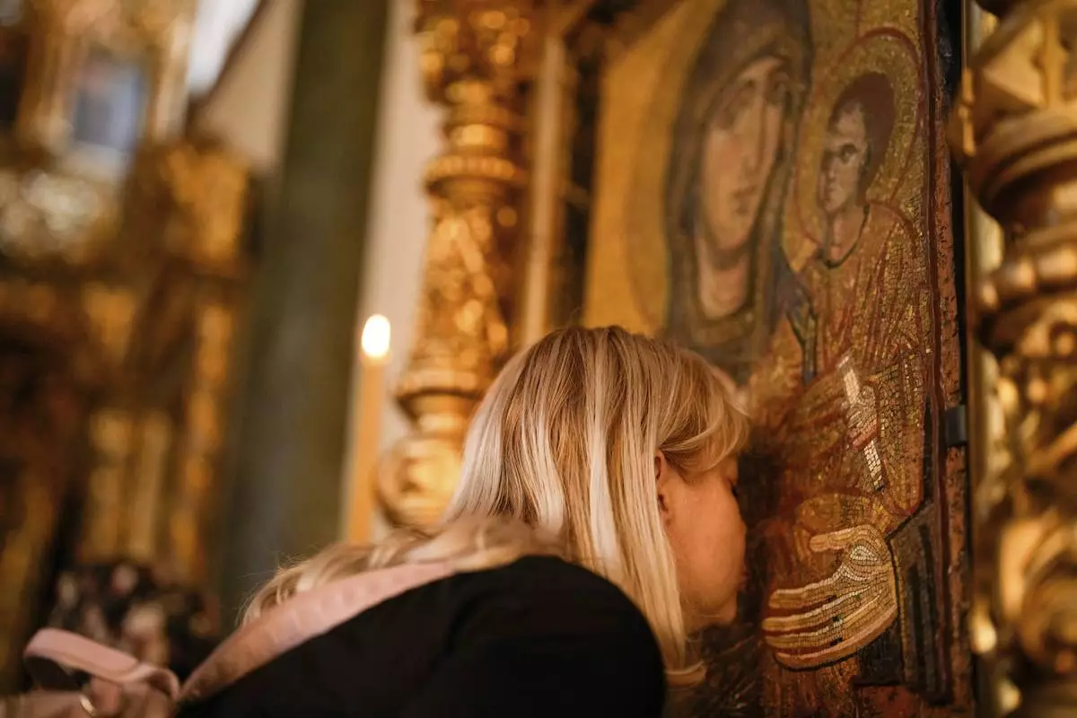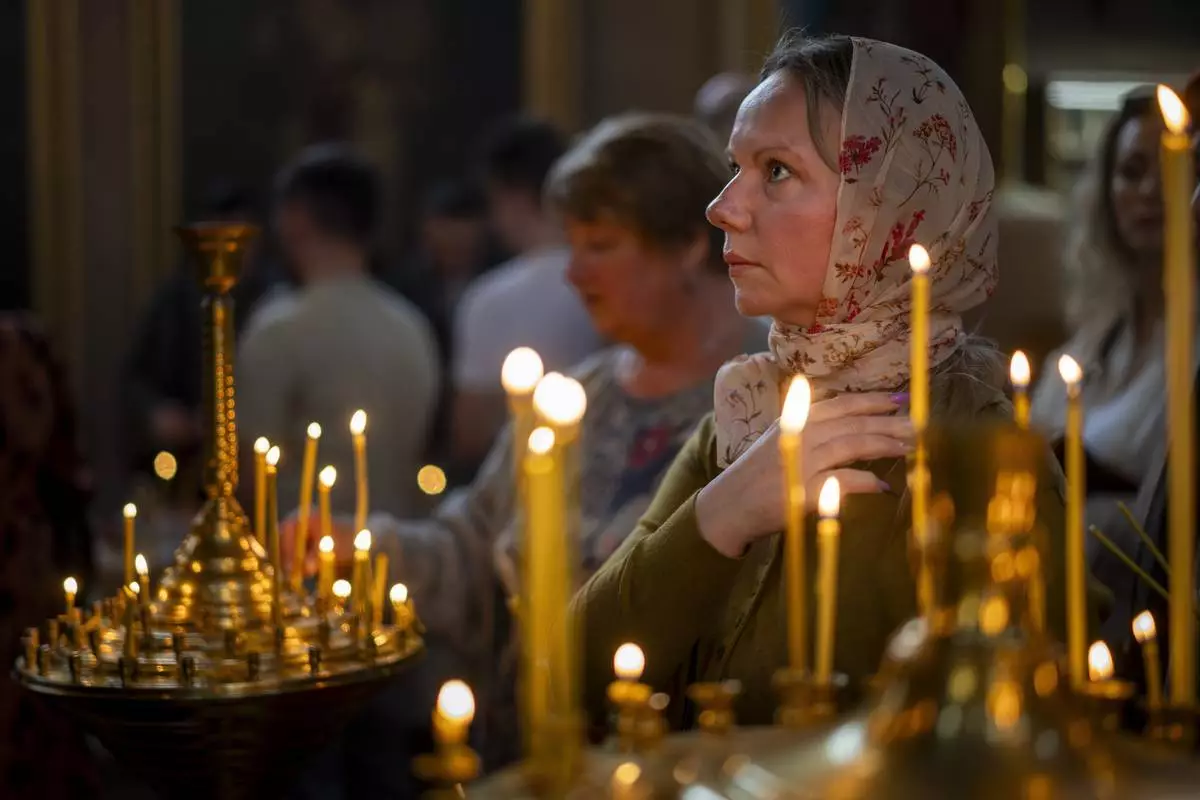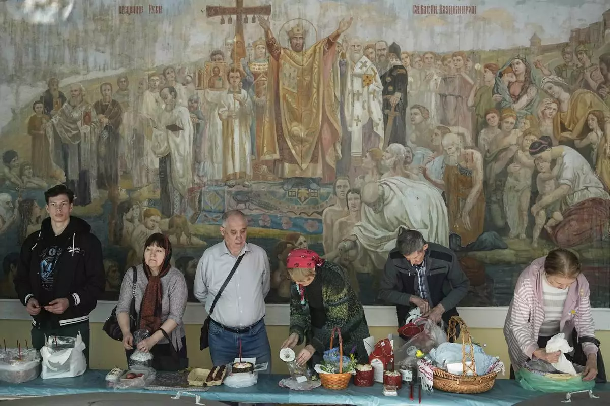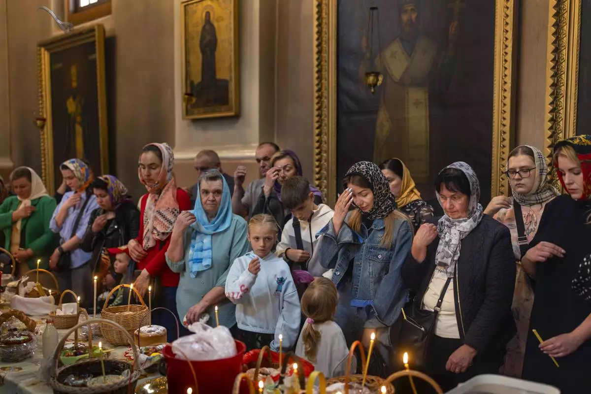 Believers pray during the cake and Easter egg blessing ceremony at the Orthodox Church of the Holy Spirit in Vilnius, Lithuania, Saturday, April 19, 2025. (AP Photo/Mindaugas Kulbis)