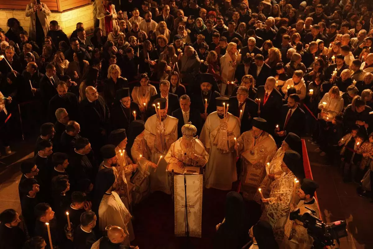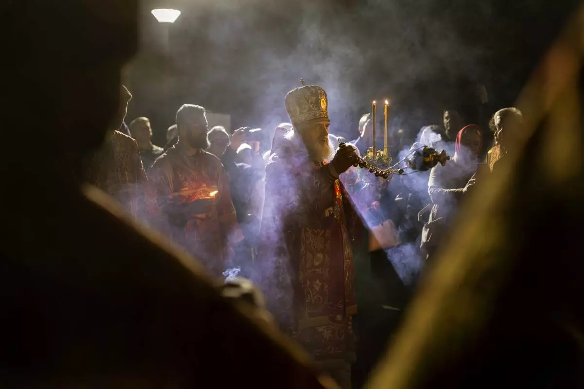 Metropolitan Inokentiy, the leader of Orthodox Church in Lithuania, leads the Easter vigil Mass at the Orthodox Church of the Holy Spirit in Vilnius, Lithuania, shortly after midnight on Sunday, April 20, 2025. (AP Photo/Mindaugas Kulbis)