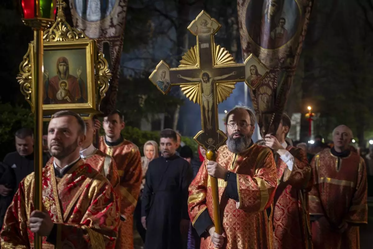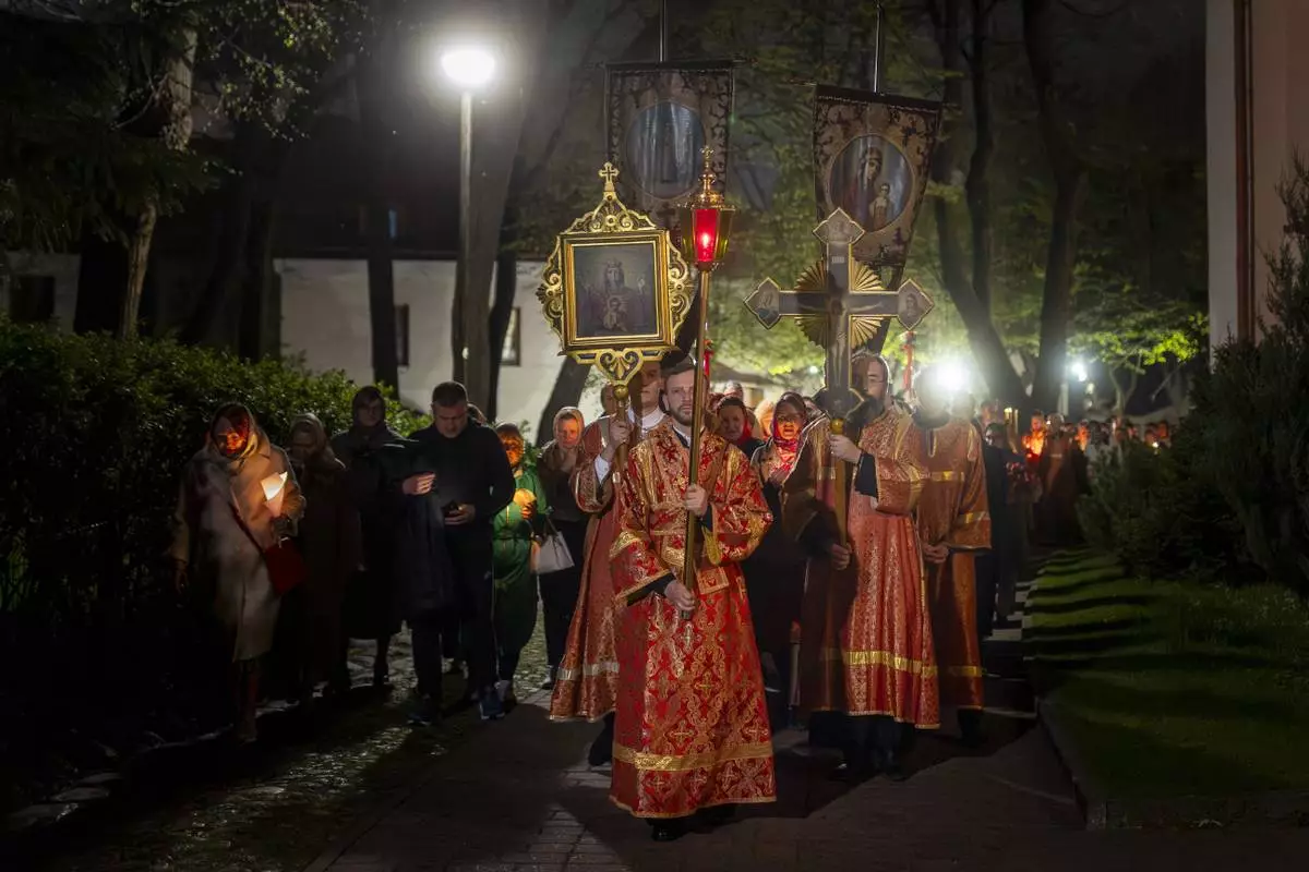 Lithuanian Orthodox priests walk in the Easter procession outside the Orthodox Church of the Holy Spirit in Vilnius, Lithuania, shortly after midnight, Sunday, April 20, 2025. (AP Photo/Mindaugas Kulbis)