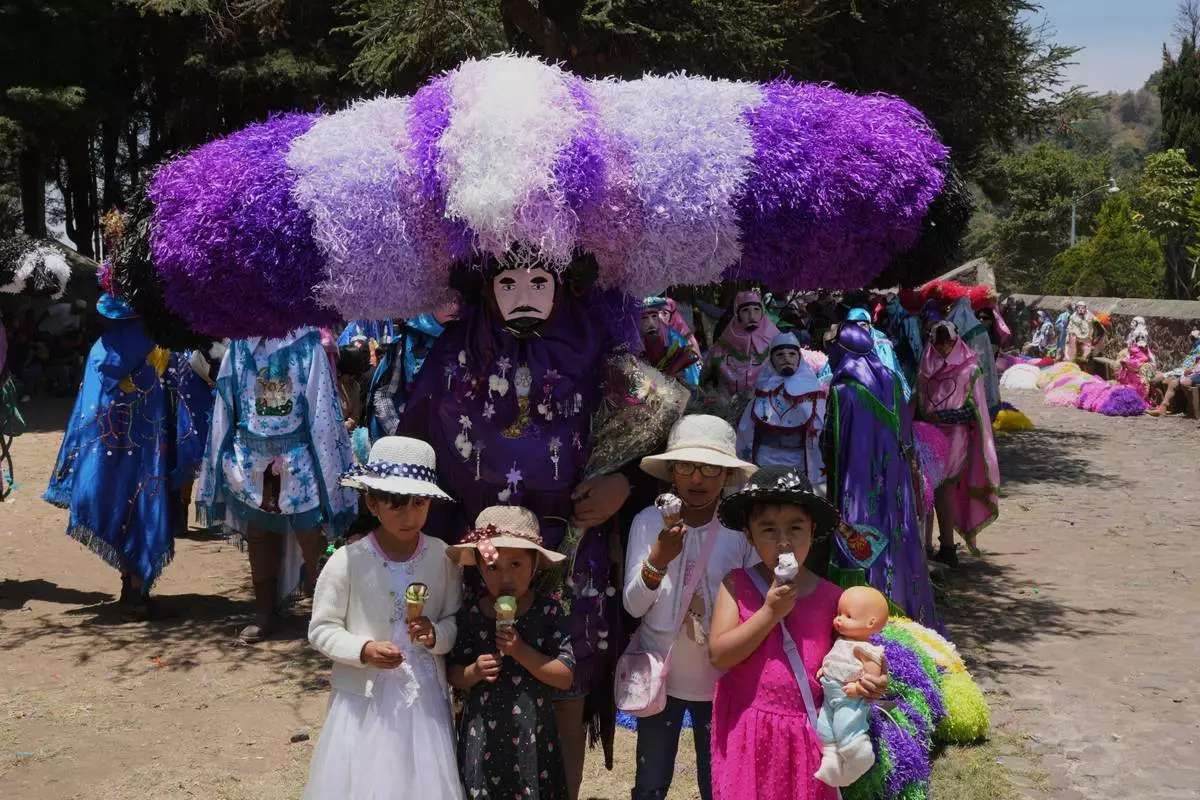 Children pose for a photo with a reveler, known as a sayon, in a tissue paper hat during Easter Day celebrations in Tetela del Volcan, Mexico, Sunday, April 20, 2025. (AP Photo/Eduardo Verdugo)