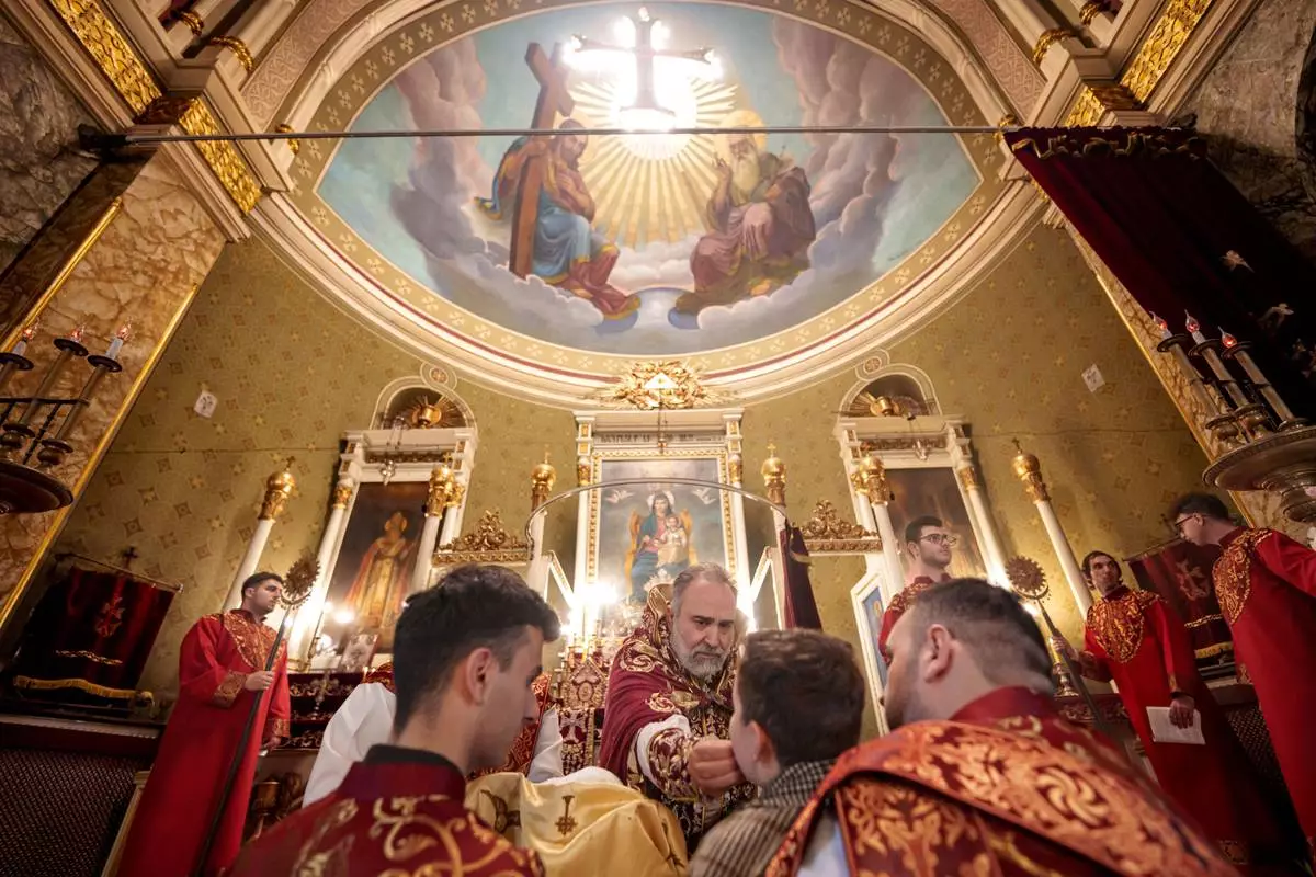 A boy receives the holy communion from Iraq-born Armenian church Archbishop Datev Hagopian during the Orthodox Easter service at the Armenian cathedral in Bucharest, Romania, Saturday, April 19, 2025. (AP Photo/Andreea Alexandru)