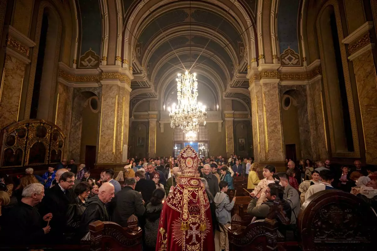 Iraq-born Armenian church Archbishop Datev Hagopian shares the holy light during the Orthodox Easter service at the Armenian cathedral in Bucharest, Romania, Saturday, April 19, 2025. (AP Photo/Andreea Alexandru)