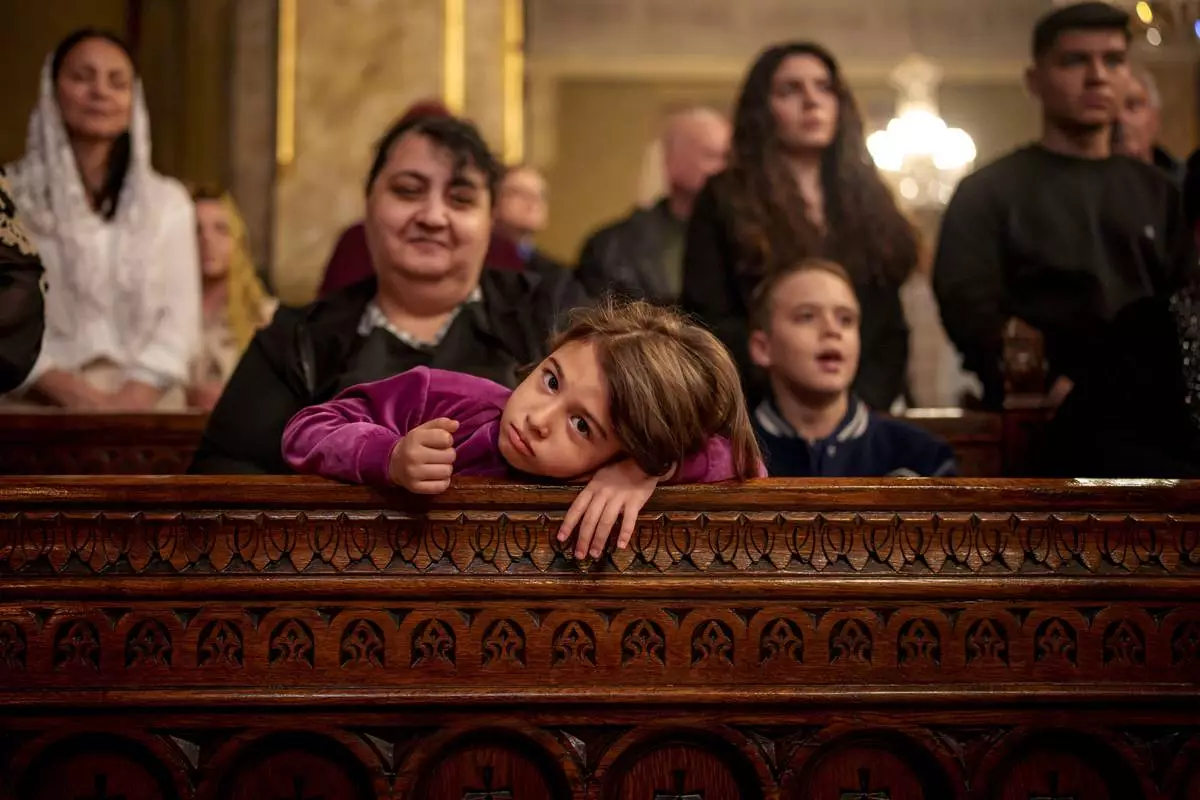 A child rests her head on a pew frontal during the Orthodox Easter service at the Armenian cathedral in Bucharest, Romania, Saturday, April 19, 2025. (AP Photo/Andreea Alexandru)