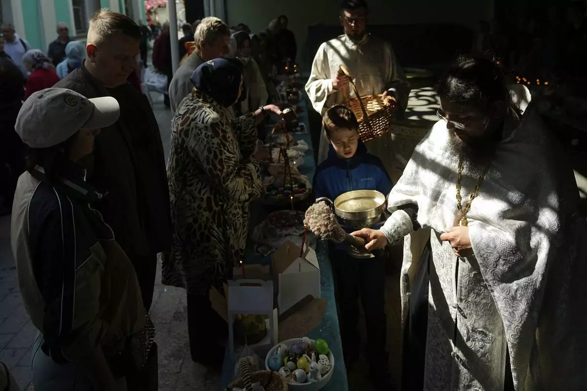 A Lithuanian Orthodox priest blesses cakes and Easter eggs during an Orthodox Easter ceremony at the Orthodox Church of the Holy Spirit in Vilnius, Lithuania, Saturday, April 19, 2025. (AP Photo/Mindaugas Kulbis)