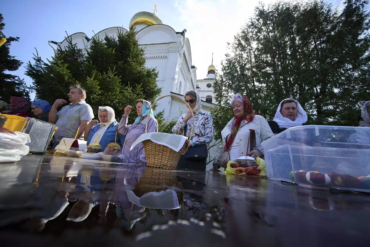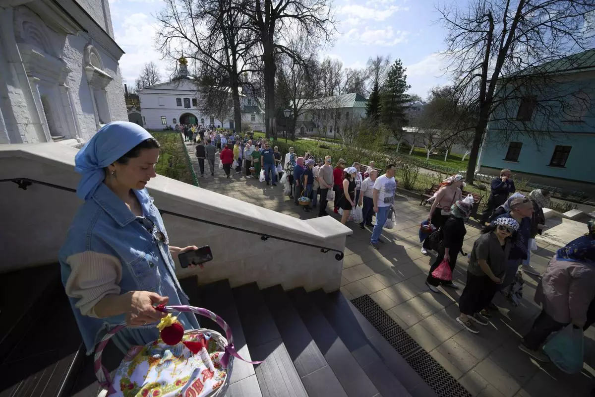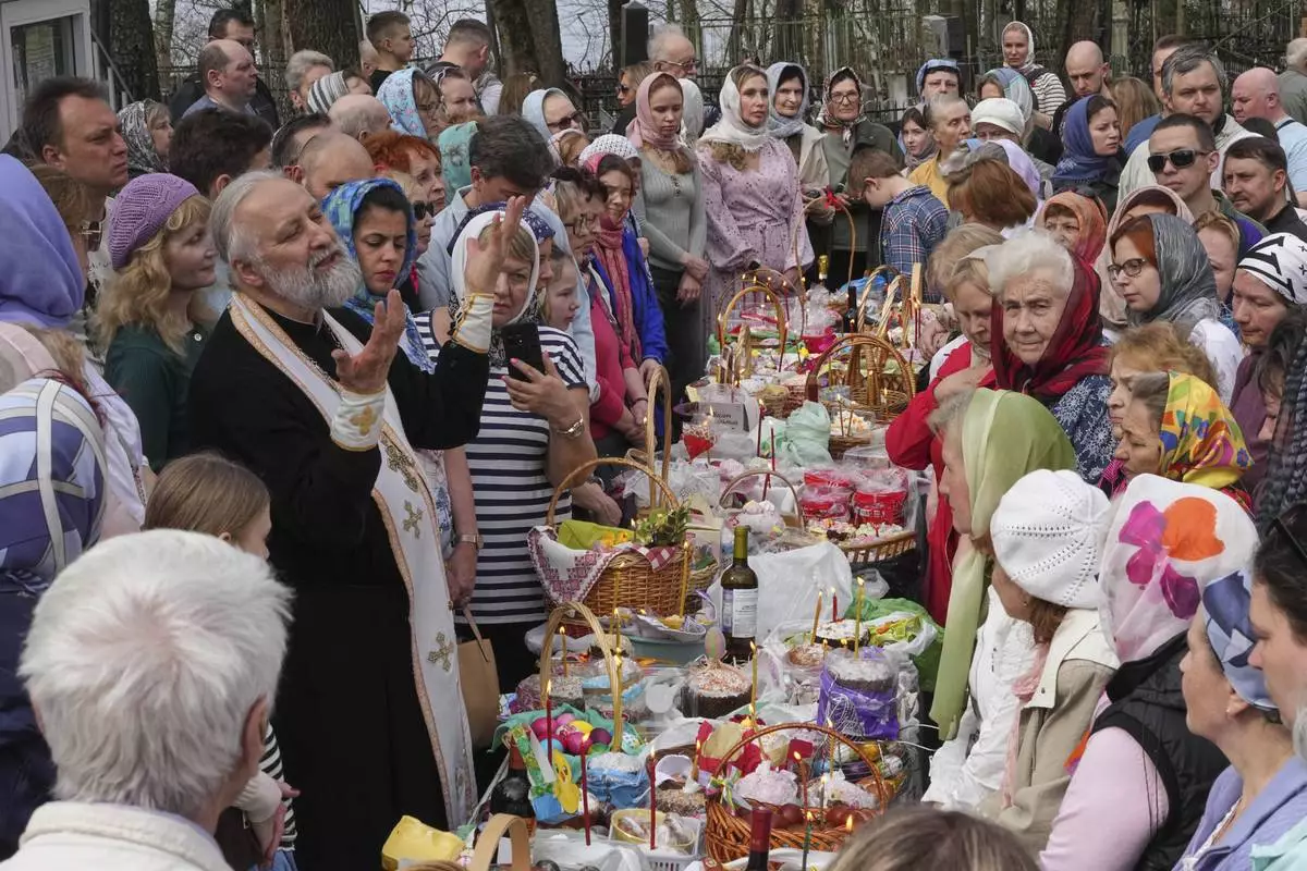 Believers with their baskets containing traditional cakes and painted eggs cross themselves as they wait to be blessed by a Russian Orthodox priest, in preparation for an Easter celebration at the St. Boris and Gleb Monastery in the old Russian town of Dmitrov, some 70 km (44 miles) north of Moscow, Russia, Saturday, April 19, 2025. (AP Photo/Alexander Zemlianichenko)