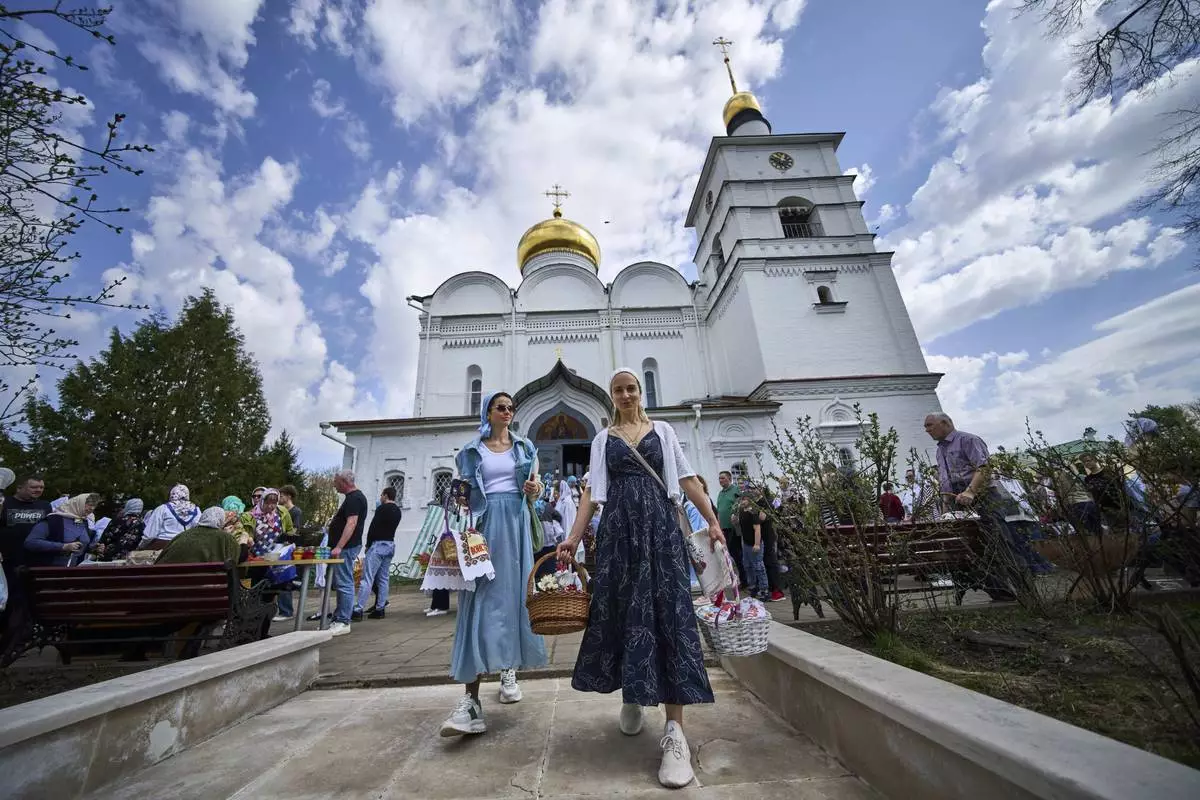 Two young women carry their baskets containing traditional cakes and painted eggs as Believers wait to be blessed by a Russian Orthodox priest, in preparation for an Easter celebration at the St. Boris and Gleb Monastery in the old Russian town of Dmitrov, some 70 km (44 miles) north of Moscow, Russia, Saturday, April 19, 2025. (AP Photo/Alexander Zemlianichenko)