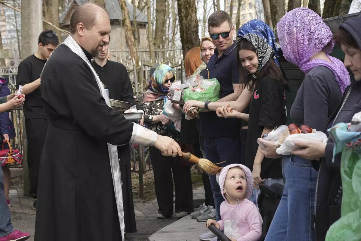 An Orthodox priest blesses believers and their traditional Easter cakes and painted eggs prepared for Easter celebration at a church in St. Petersburg, Russia, Saturday, April 19, 2025. (AP Photo/Dmitri Lovetsky)