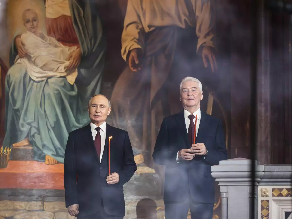 Russian President Vladimir Putin, left, and Moscow Mayor Sergei Sobyanin attend the Orthodox Easter service at Christ the Saviour Cathedral in Moscow, Russia, on Sunday, April 20, 2025. (Oleg Varov/Russian Orthodox Church Press Service via AP)
