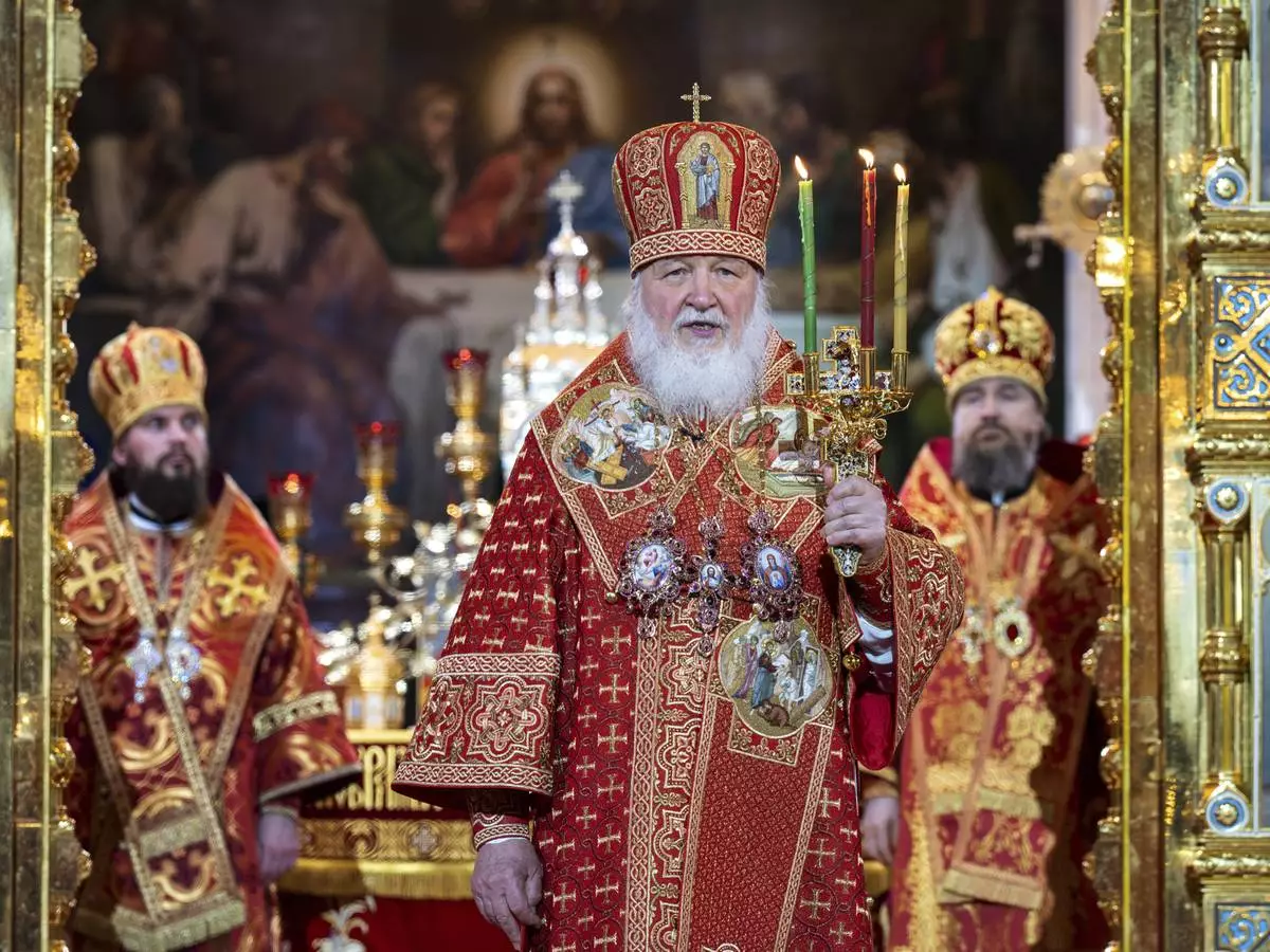 Russian Orthodox Church Patriarch Kirill leads the Orthodox Easter service at Christ the Saviour Cathedral in Moscow, Russia, on Sunday, April 20, 2025. (Oleg Varov/Russian Orthodox Church Press Service via AP)