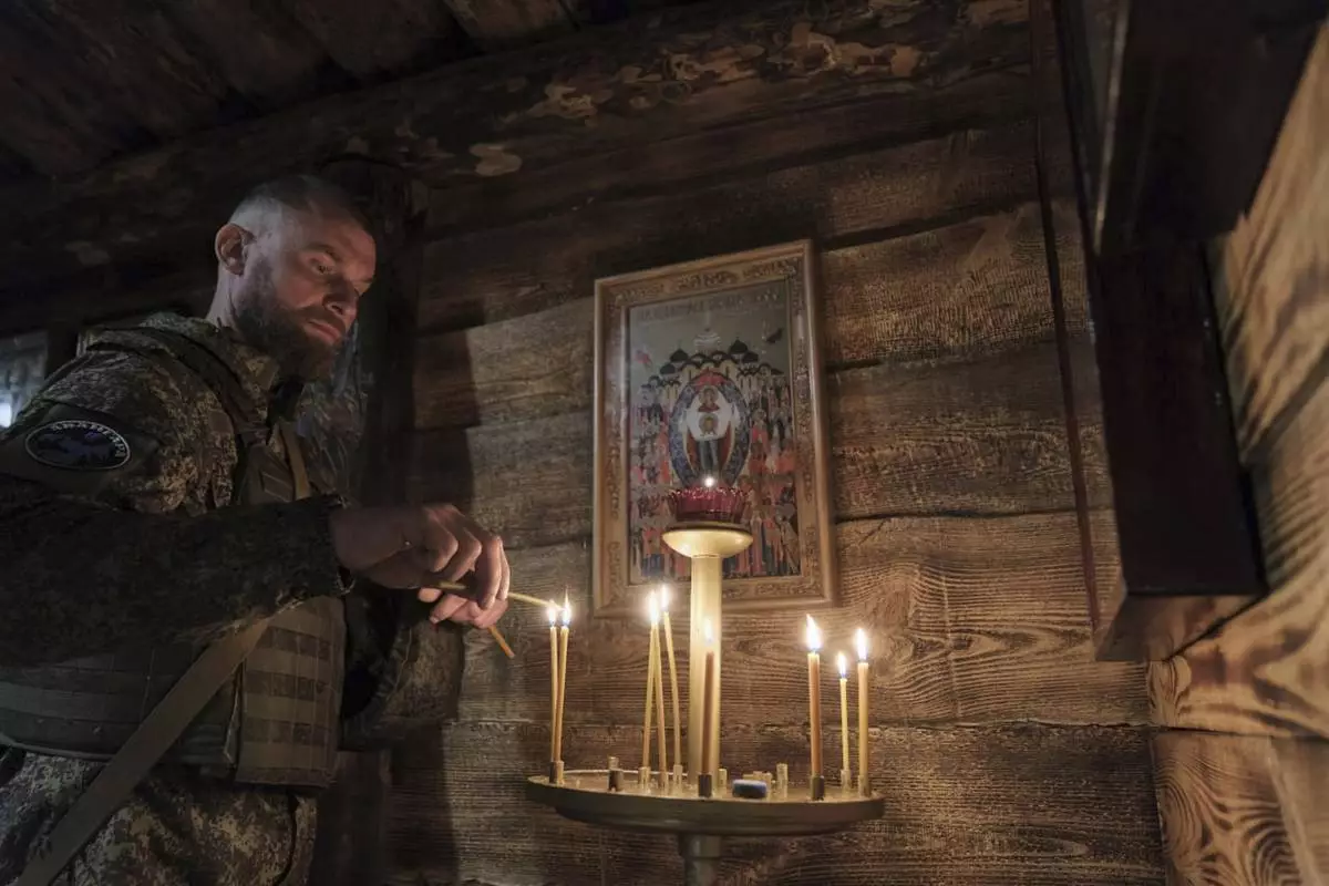 In this photo taken from video distributed by Russian Defense Ministry Press Service on Sunday, April 20, 2025, a Russian soldier lights a candle attending a religion service on eve of Orthodox Easter at an unspecified location in Ukraine. (Russian Defense Ministry Press Service via AP)