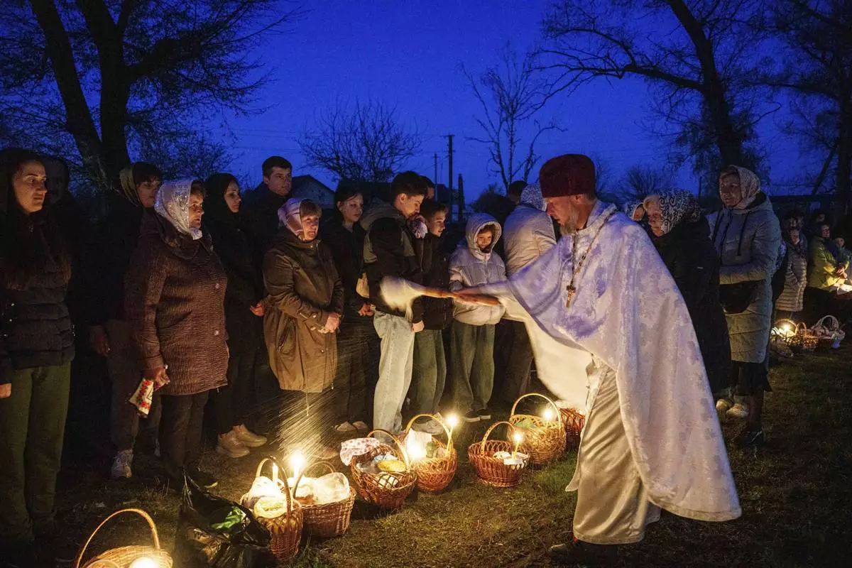 Priest Serhii Zezul blesses Easter baskets in front of a church destroyed in fighting between Russian and Ukrainian forces, during celebration of the Orthodox Easter in Lukashivka village, Ukraine, on Sunday, April 20, 2025. (AP Photo/Evgeniy Maloletka)