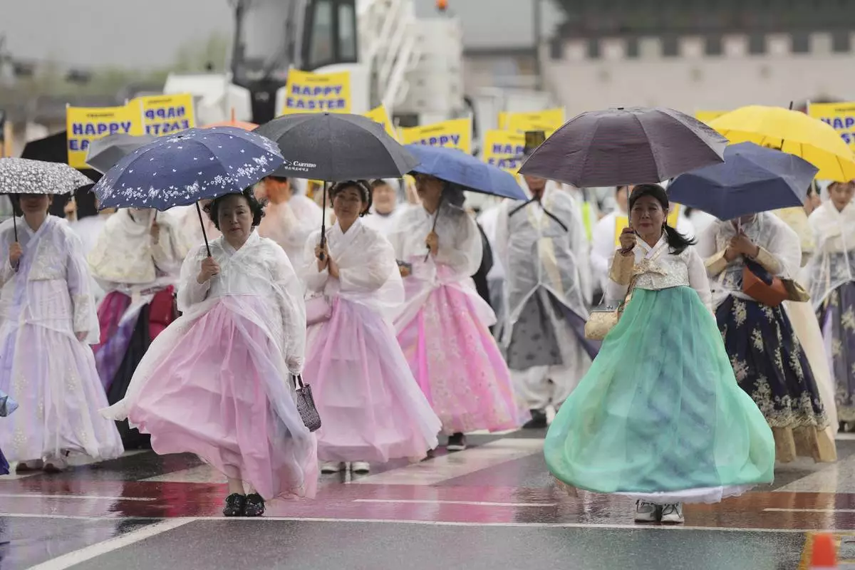 Participants march in the rain during the Easter parade in Seoul, South Korea, Saturday, April 19, 2025. (AP Photo/Lee Jin-man)