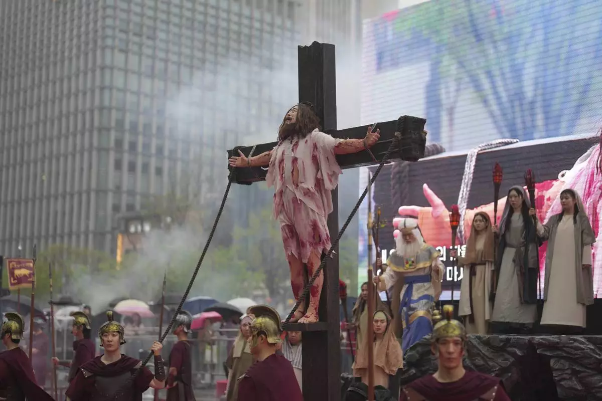 Performers reenact during the Easter parade in Seoul, South Korea, Saturday, April 19, 2025. (AP Photo/Lee Jin-man)