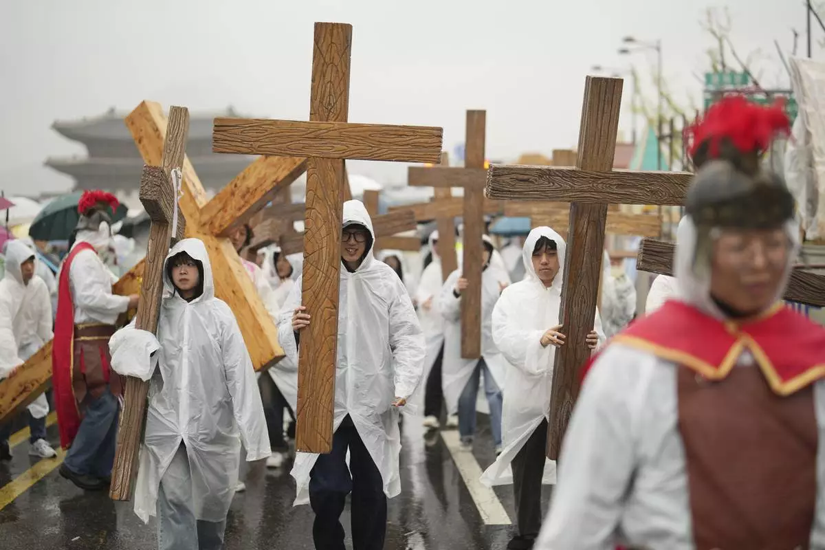 Participants holding crosses march in the rain during the Easter parade in Seoul, South Korea, Saturday, April 19, 2025. (AP Photo/Lee Jin-man)