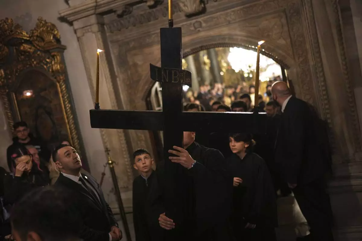 A Christian Orthodox worshipper carries a wooden cross during the service of the Graveside Lamentation at the Patriarchal Church of St. George, in Istanbul, Turkey, Friday, April 18, 2025. (AP Photo/Francisco Seco)