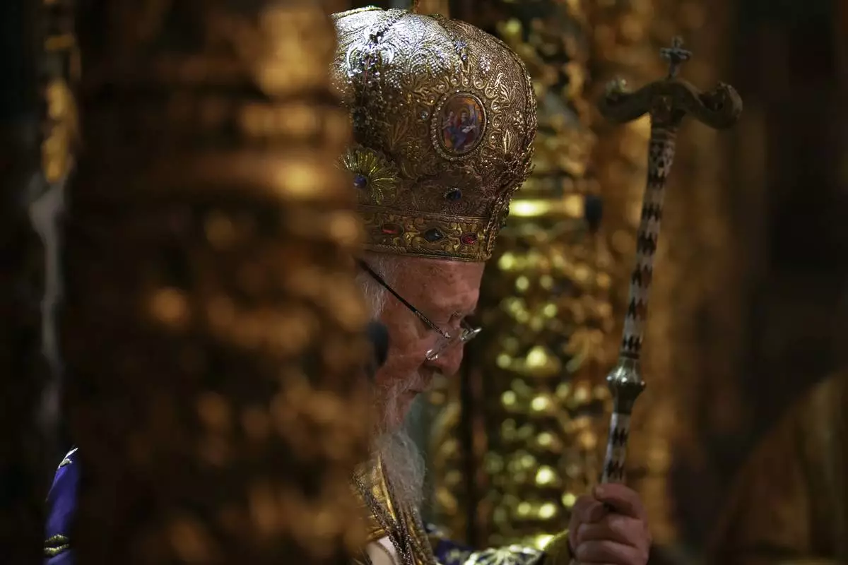 Ecumenical Patriarch Bartholomew I, the spiritual leader of the world's Eastern Orthodox Christians, leads the Easter Sunday Resurrection liturgy, marking the end of the Holy Week at the Patriarchal Church of St. George in Istanbul, Turkey, Sunday, April 20, 2025. (AP Photo/Emrah Gurel)