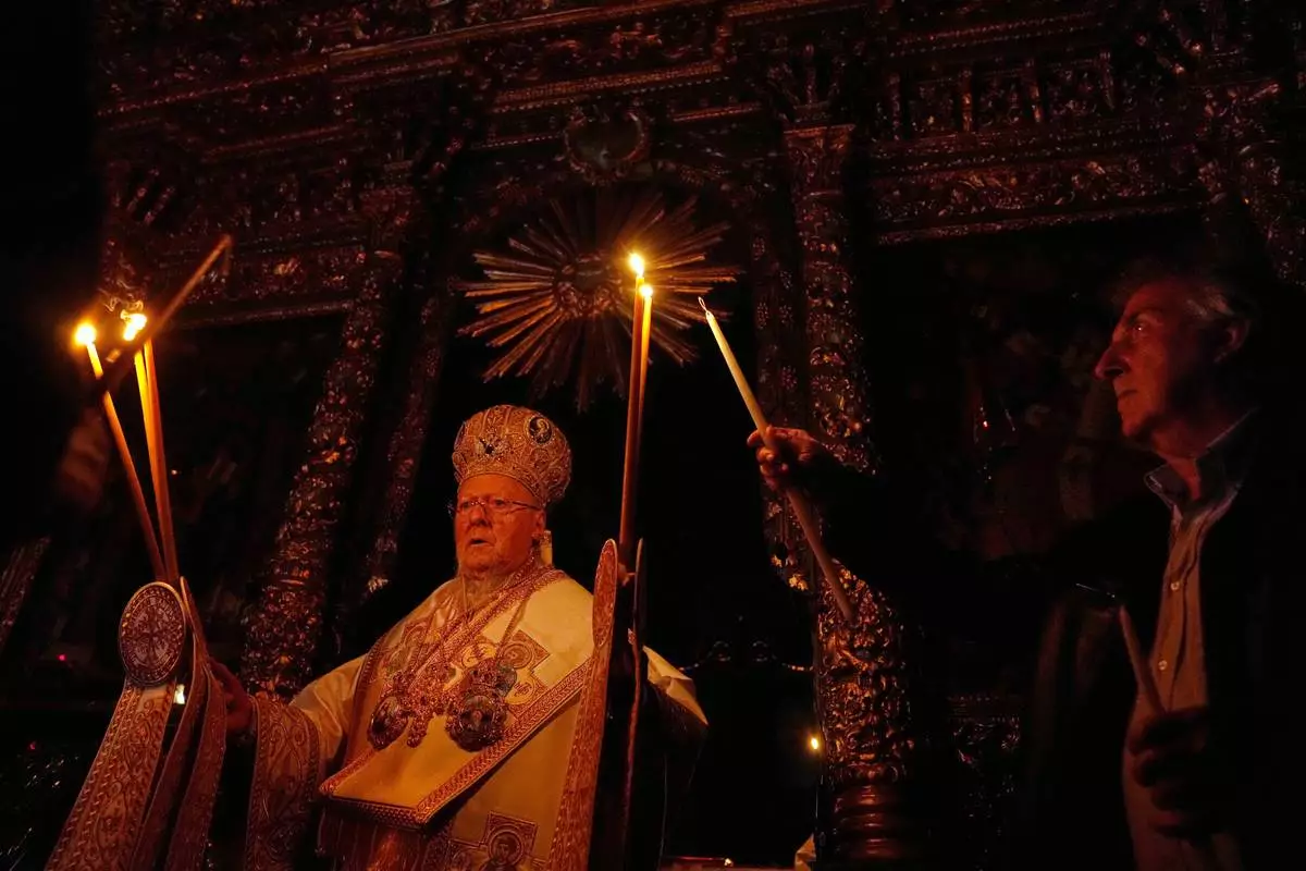 Ecumenical Patriarch Bartholomew I, left, the spiritual leader of the world's Eastern Orthodox Christians, holds candles as he conducts the Easter Vigil Mass on the eve of Christ's resurrection at the Patriarchal Church of St. George in Istanbul, Turkey, Sunday, April 20, 2025. (AP Photo/Khalil Hamra)