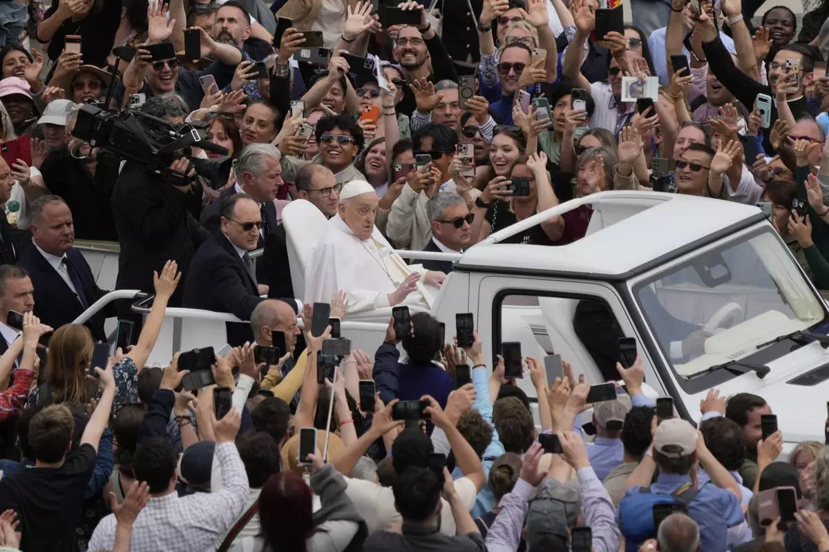 Pope Francis tours St. Peter's Square in his popemobile after bestowing the Urbi et Orbi (Latin for to the city and to the world) blessing at the end of the Easter mass presided over by Cardinal Angelo Comastri in St. Peter's Square at the Vatican Sunday, April 20, 2025.(AP Photo/Gregorio Borgia)