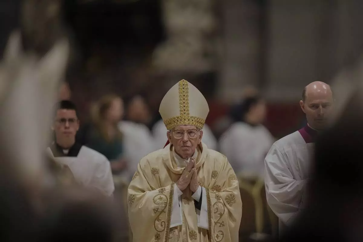 Dean of the College of Cardinals Giovanni Battista Re leads the Easter vigil inside St. Peter's Basilica at the Vatican, Saturday, April 19, 2025. (AP Photo/Alessandra Tarantino)