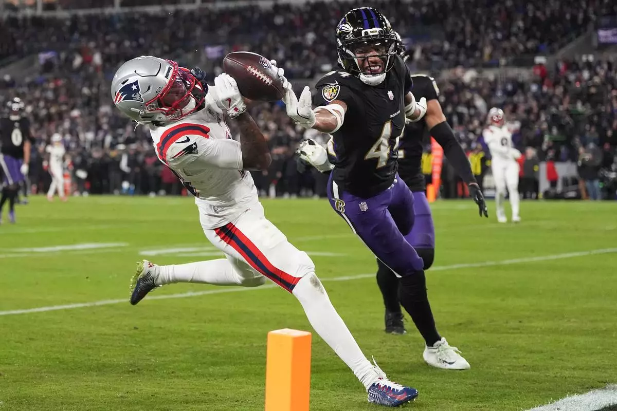 New England Patriots wide receiver Kyle Williams, left, catches a touchdown against Baltimore Ravens cornerback Marlon Humphrey (44) during the second half of an NFL football game, Sunday, Dec. 21, 2025, in Baltimore. (AP Photo/Stephanie Scarbrough)