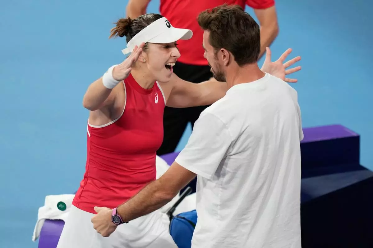 Belinda Bencic of Switzerland, left, celebrates with teammate Stan Wawrinka after defeting Iga Swiatek of Poland in their final match at the United Cup tennis tournament in Sydney, Sunday, Jan. 11, 2026. (AP Photo/Rick Rycroft)