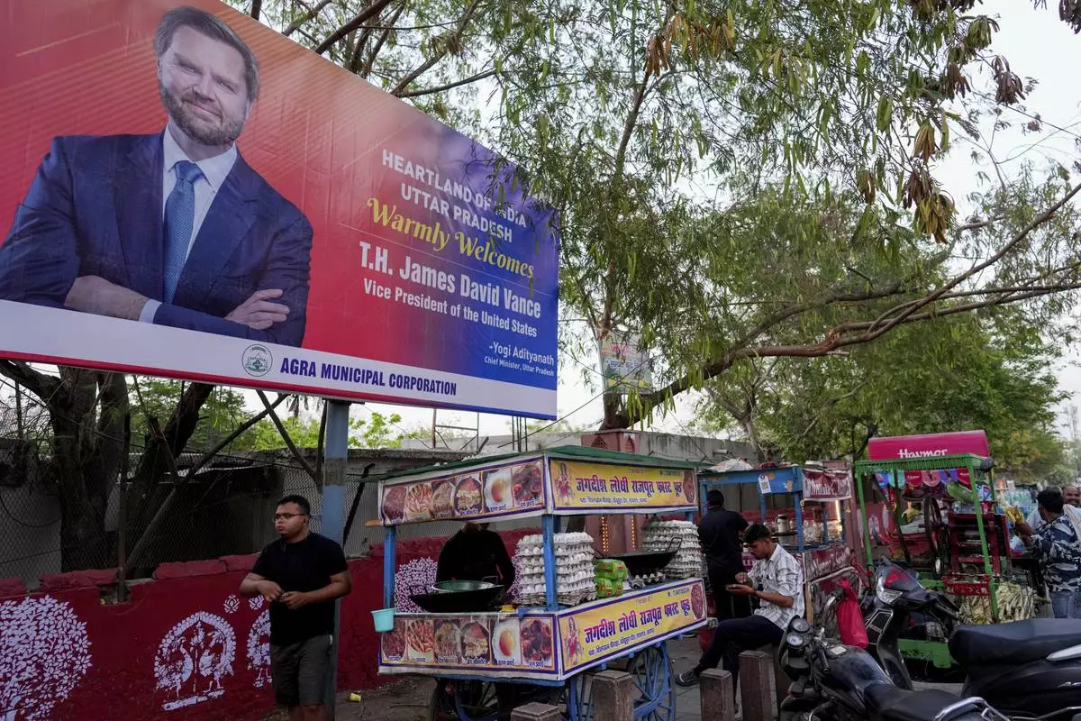 A vendor sells food on a road leading to the Taj Mahal under a banner welcoming U.S. Vice president JD Vance in Agra, India, Tuesday, April 22, 2025. (AP Photo/Rajesh Kumar Singh)