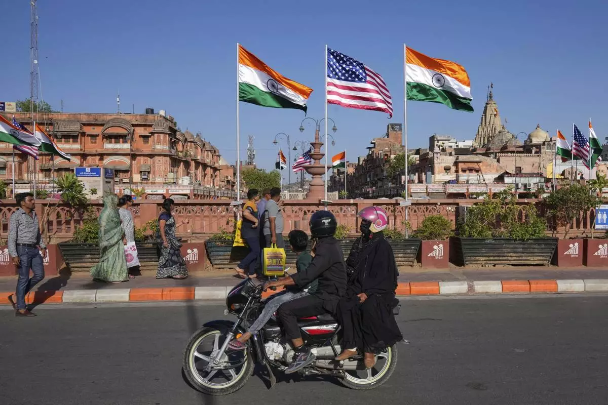 A family on a motorcycle watches Indian and US flags put up ahead of the US Vice President JD Vance visit in Jaipur, India, Monday, April 21, 2025. (AP Photo/Manish Swarup)