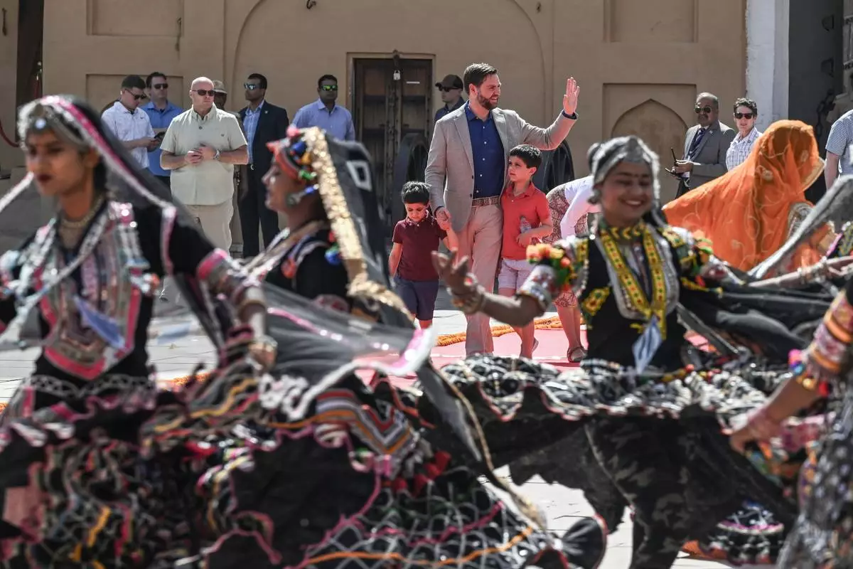 U.S. Vice President JD Vance and his sons, Vivek, left, and Ewan watch a cultural performance at Amber Fort, a historical site, in Jaipur, India, Tuesday, April 22, 2025. (Kenny Holston/The New York Times via AP, Pool)