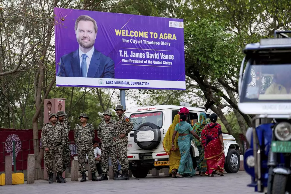 Security personnel stand guard on a road leading to the Taj Mahal under the banner welcoming U.S. Vice President JD Vance in Agra, India, Tuesday, April 22, 2025. (AP Photo/Rajesh Kumar Singh)