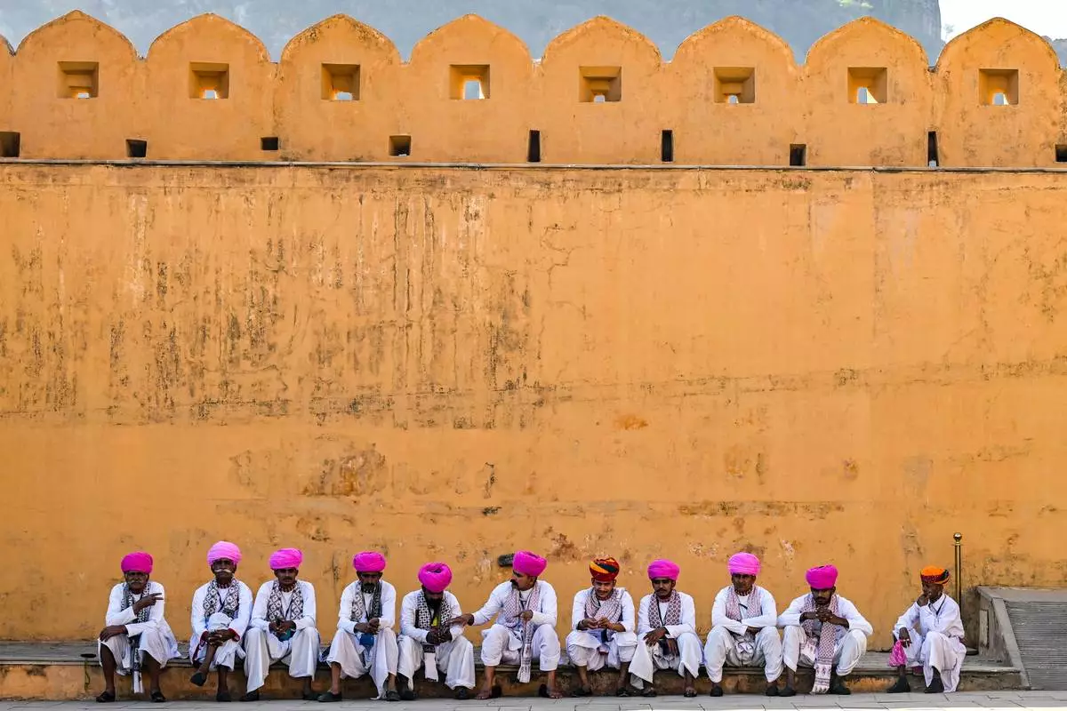 Men wearing traditional attire sit in the shade prior to conducting a cultural performance for U.S. Vice President JD Vance and his family at Amber Fort, a historical site, in Jaipur, India, Tuesday, April 22, 2025. (Kenny Holston/The New York Times via AP, Pool)