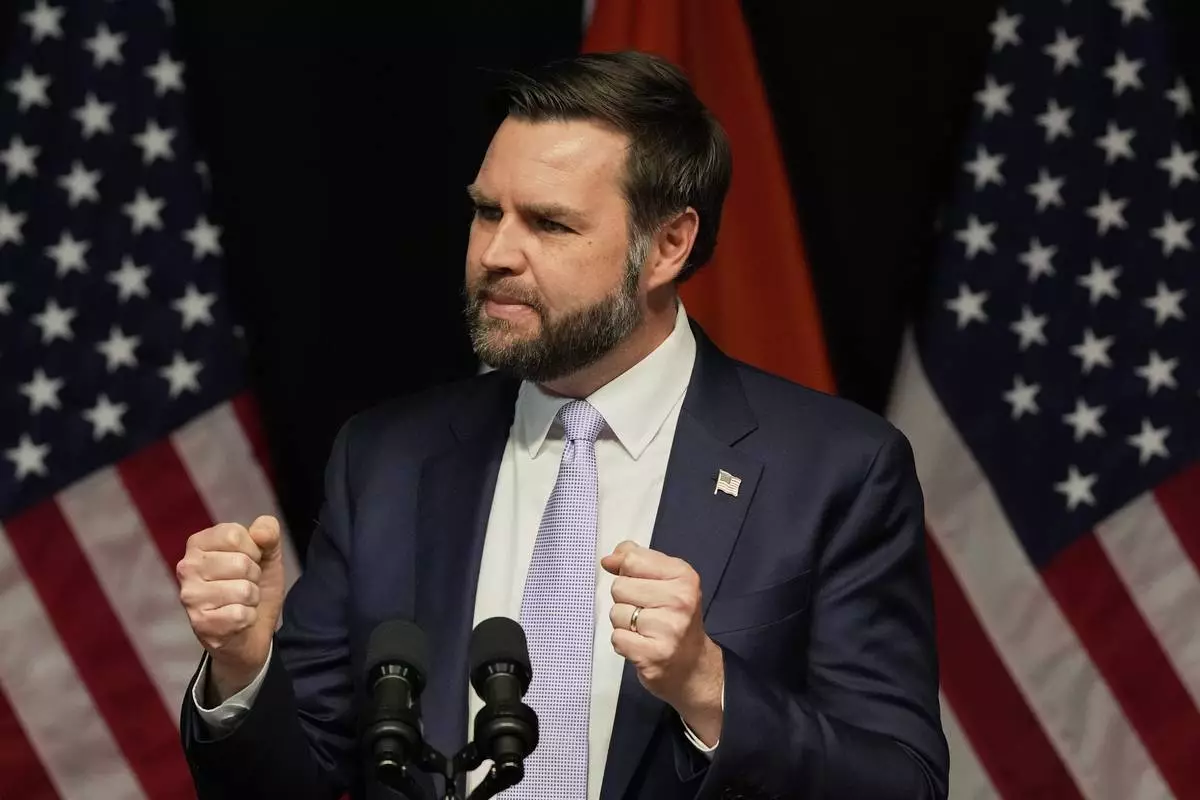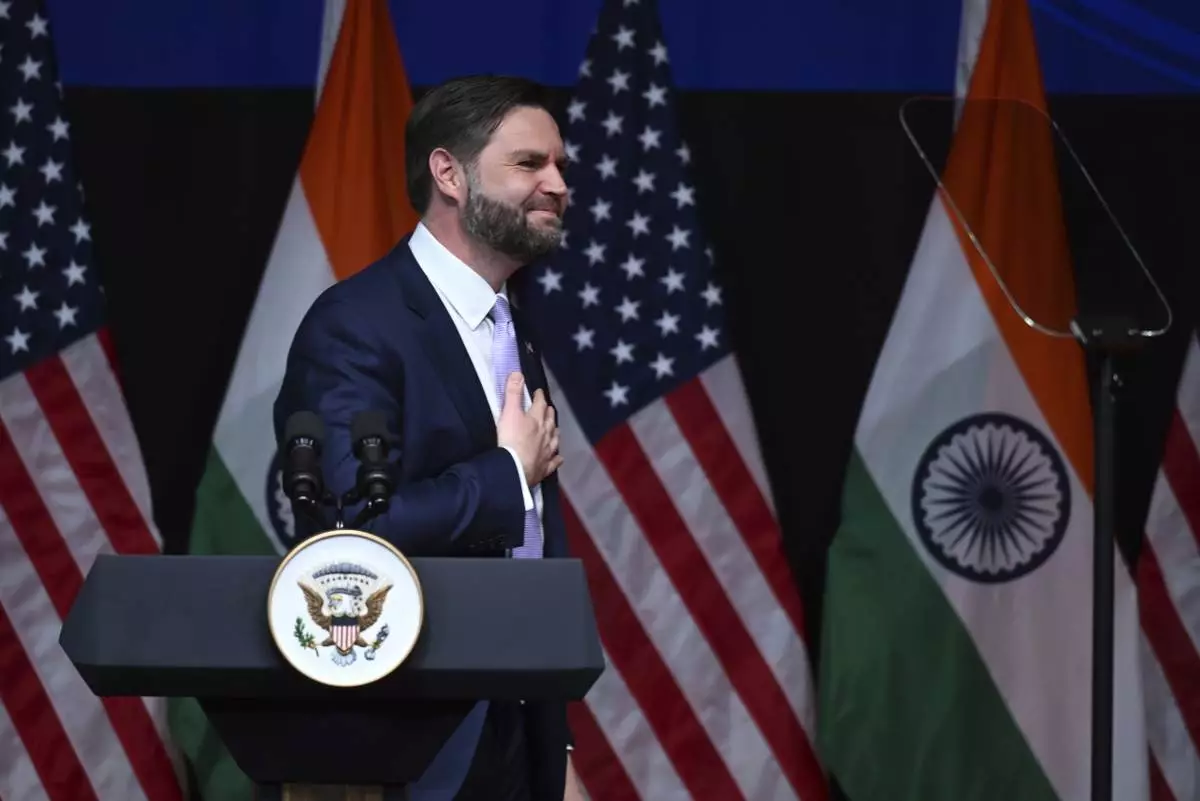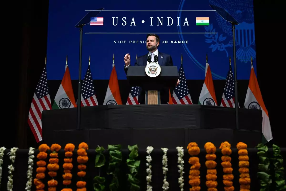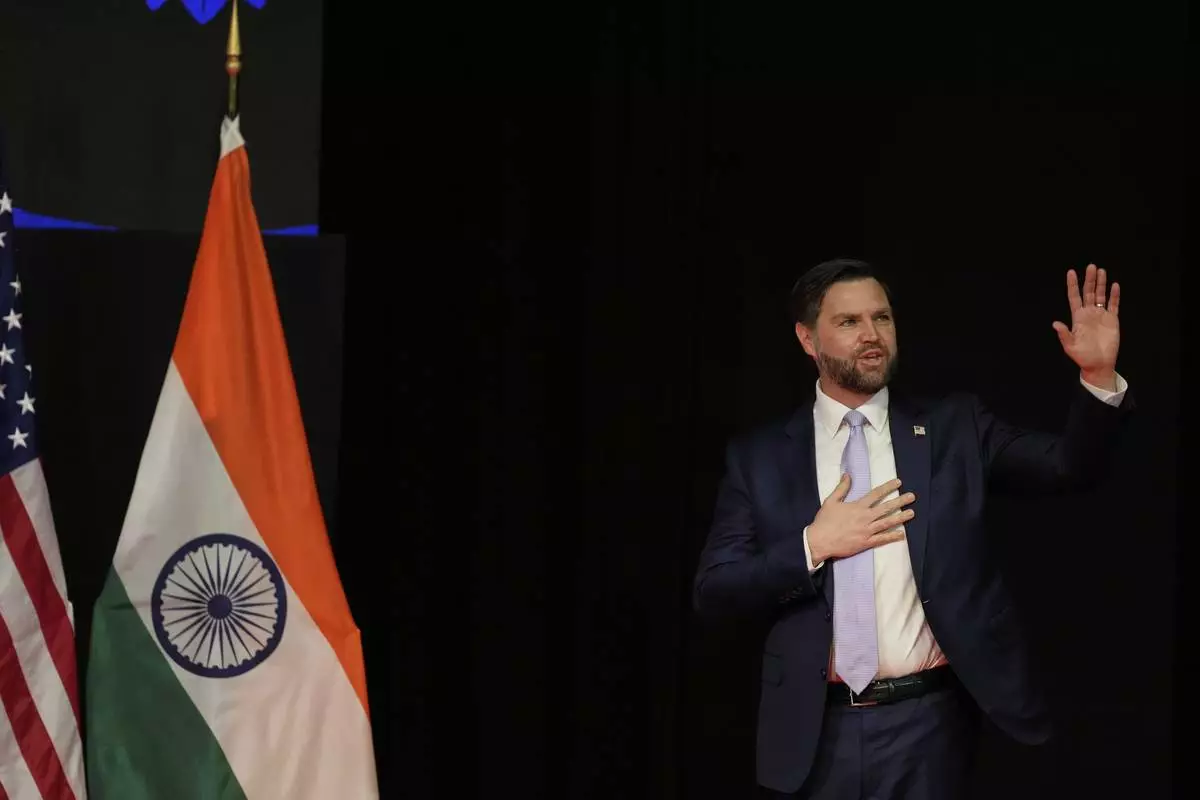 U.S. Vice President JD Vance delivers remarks at the Rajasthan International Centre in Jaipur, India, Tuesday, April 22, 2025. (Kenny Holston/The New York Times via AP, Pool)