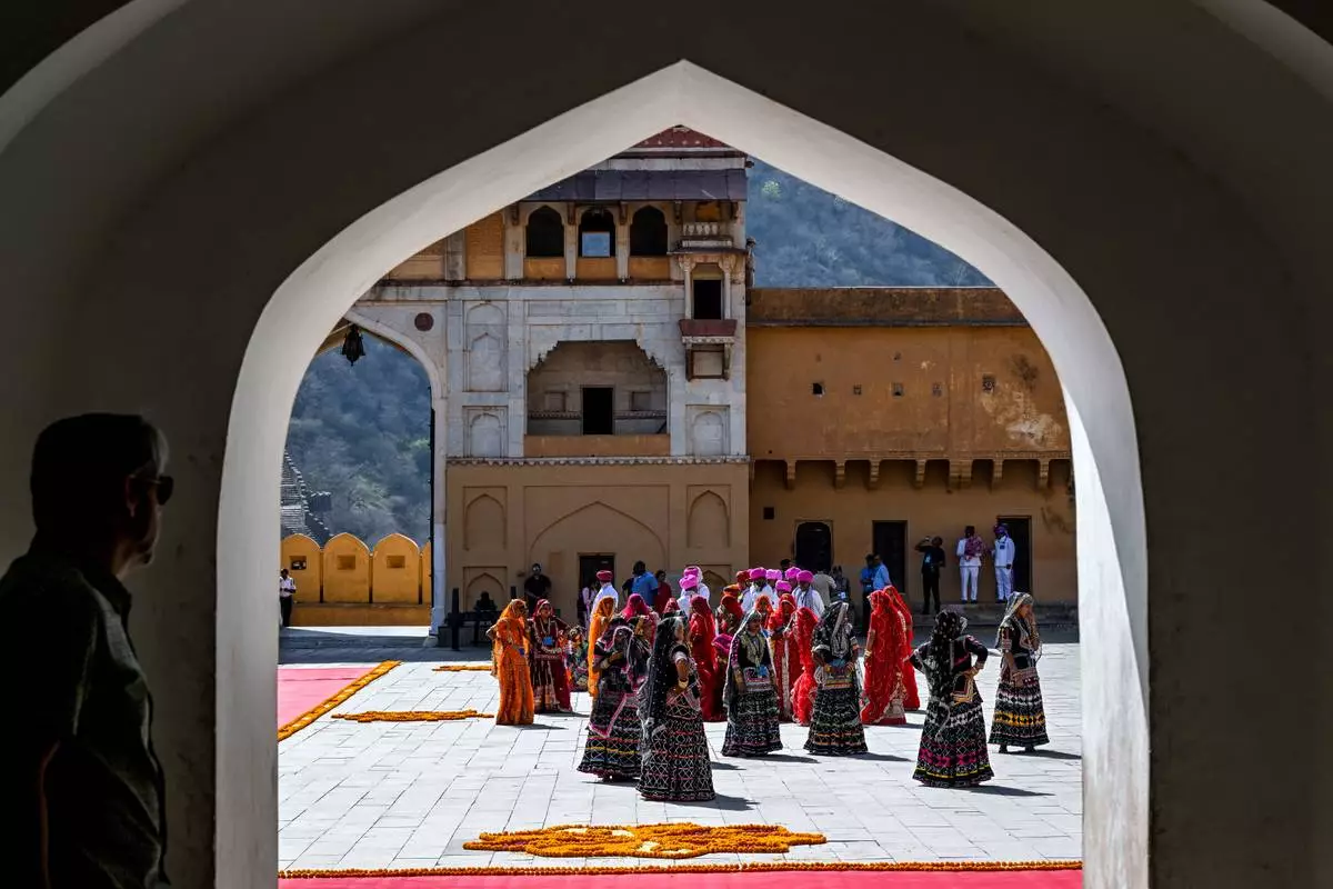 Men and women dressed in traditional attire prepare to do a cultural performance for U.S. Vice President JD Vance and his family at Amber Fort, a historical site, in Jaipur, India, Tuesday, April 22, 2025. (Kenny Holston/The New York Times via AP, Pool)