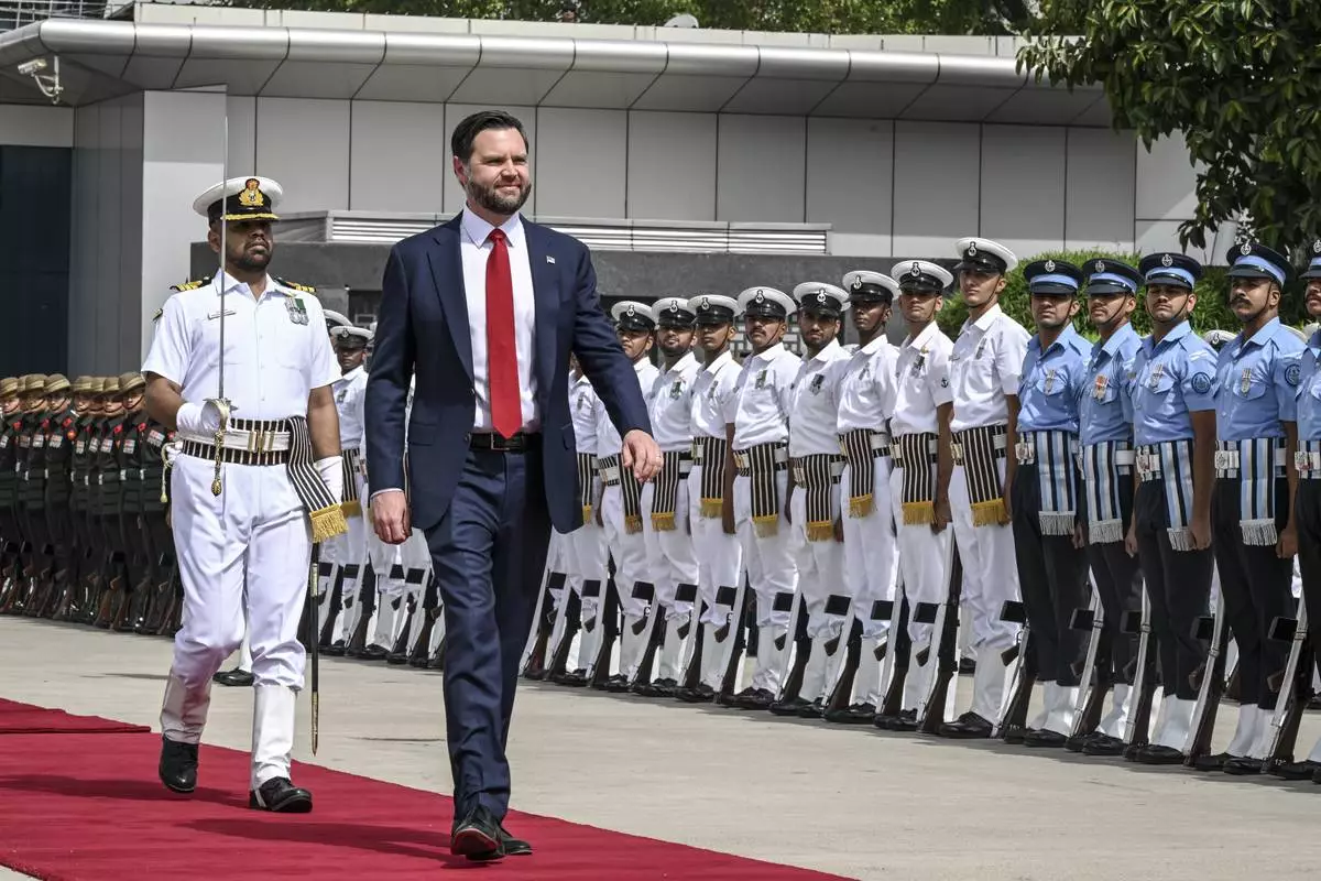 U.S. Vice President JD Vance reviews troops upon his arrival in New Delhi, India, Monday, April 21, 2025. (Kenny Holston/The New York Times via AP, Pool)