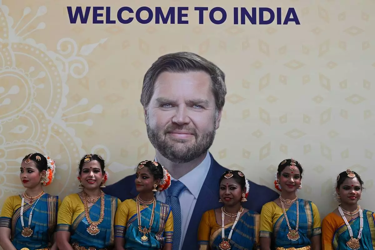 A poster of U.S. Vice President JD Vance is displayed as he arrives in New Delhi, India, Monday, April 21, 2025. (Kenny Holston/The New York Times via AP, Pool)