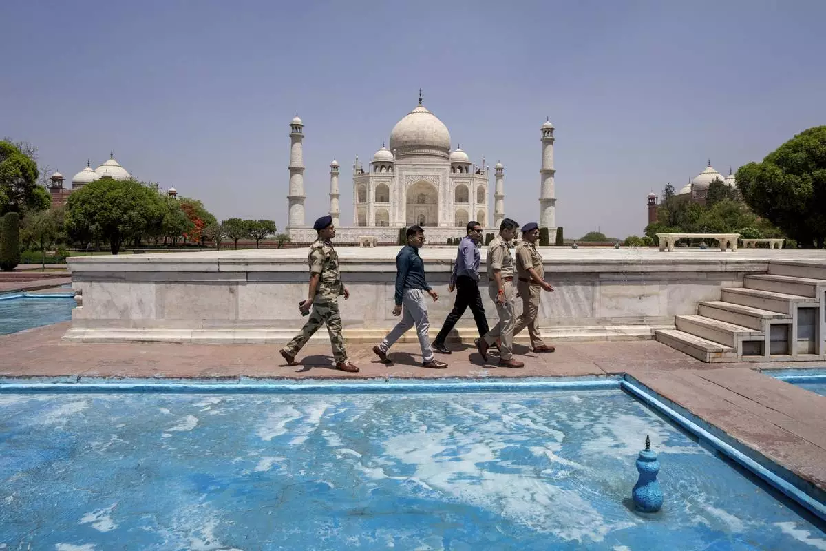 Security officers walk with the Taj Mahal in the background in Agra, India Wednesday, April 23, 2025. (AP Photo/Rajesh Kumar Singh)