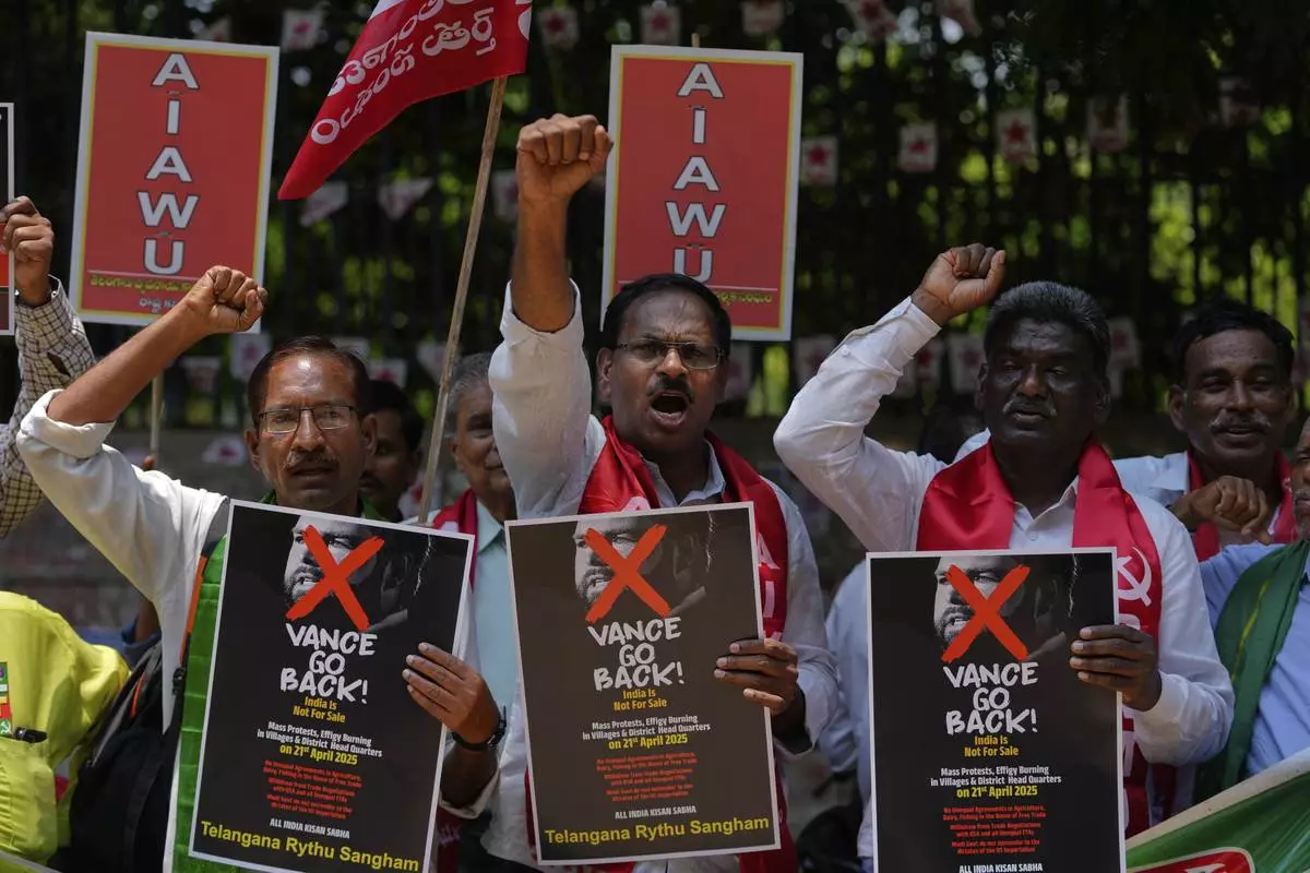 Activists of Samyukt Kisan Morcha shout slogans during a protest against the visit of U.S. Vice President JD Vance to India, in Hyderabad, India, Monday, April 21, 2025. (AP Photo/Mahesh Kumar A.)