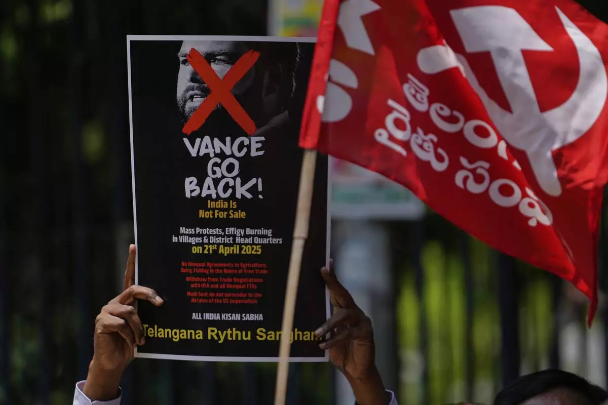 An activist of Samyukt Kisan Morcha holds a placard during a protest against the visit of U.S. Vice President JD Vance to India, in Hyderabad, India, Monday, April 21, 2025. (AP Photo/Mahesh Kumar A.)
