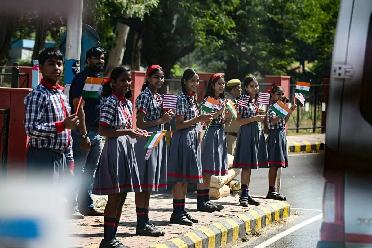 Children line the streets as U.S. Vice President JD Vance's motorcade travels through town en route to the Taj Mahal on Wednesday, April 23, 2025, in Agra, India. (Kenny Holston/The New York Times via AP, Pool)