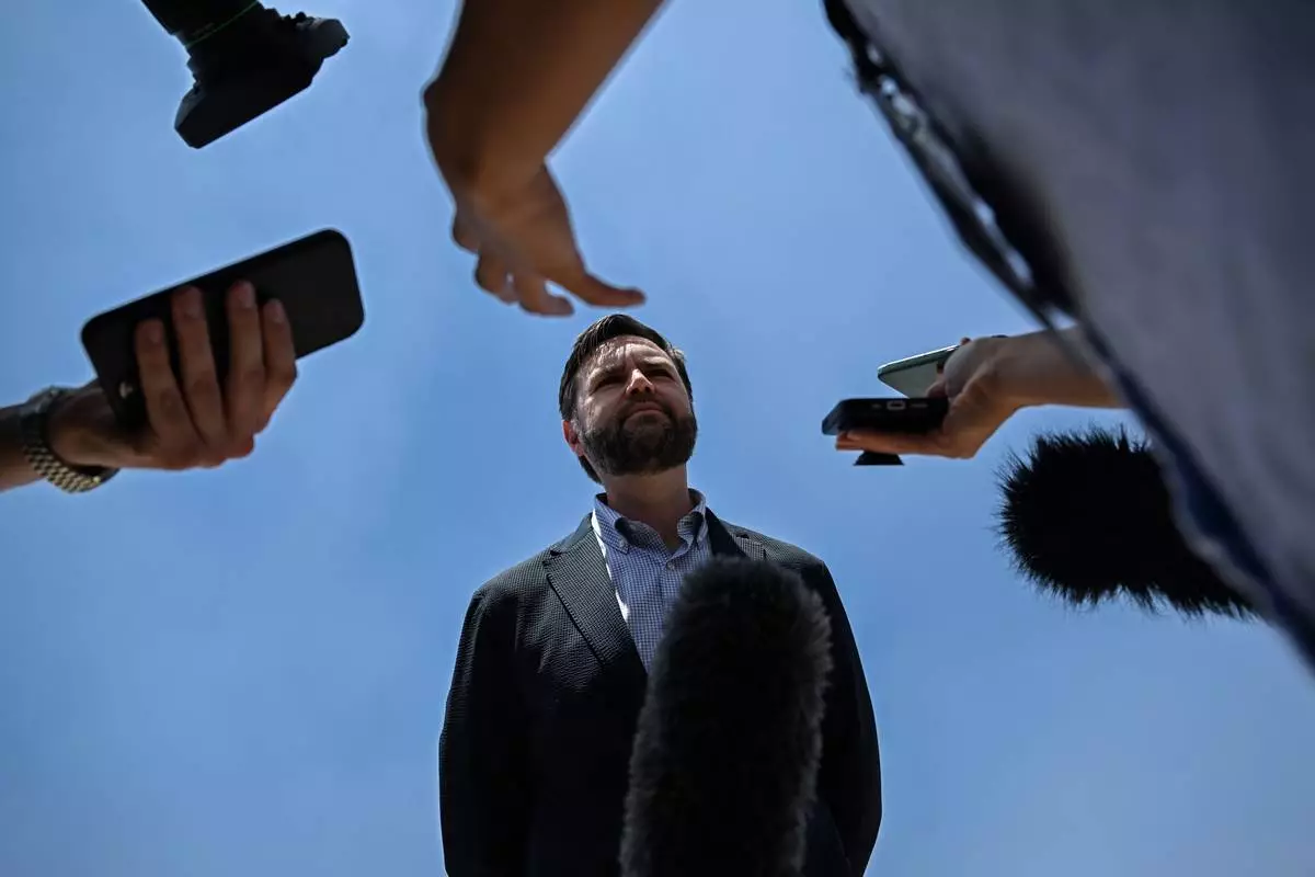 U.S. Vice President JD Vance speaks to media as he departs Agra, India en route to Jaipur, India after visiting the Taj Mahal on Wednesday, April 23, 2025, in Agra, India. (Kenny Holston/The New York Times via AP, Pool)
