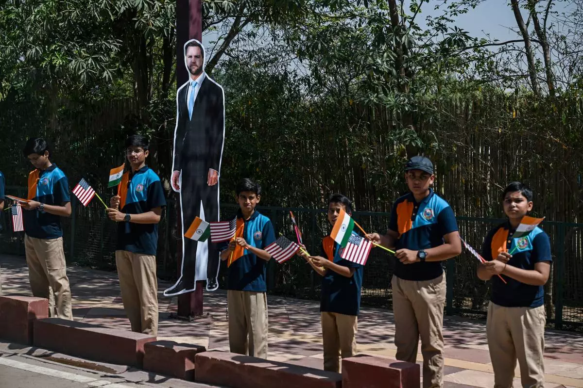 A life size cutout of U.S. Vice President JD Vance is seen as children, line the street to see U.S. Vice President JD Vance's motorcade pass by en route to the Taj Mahal in Agra, India, Wednesday, April 23, 2025. (Kenny Holston/The New York Times via AP, Pool)