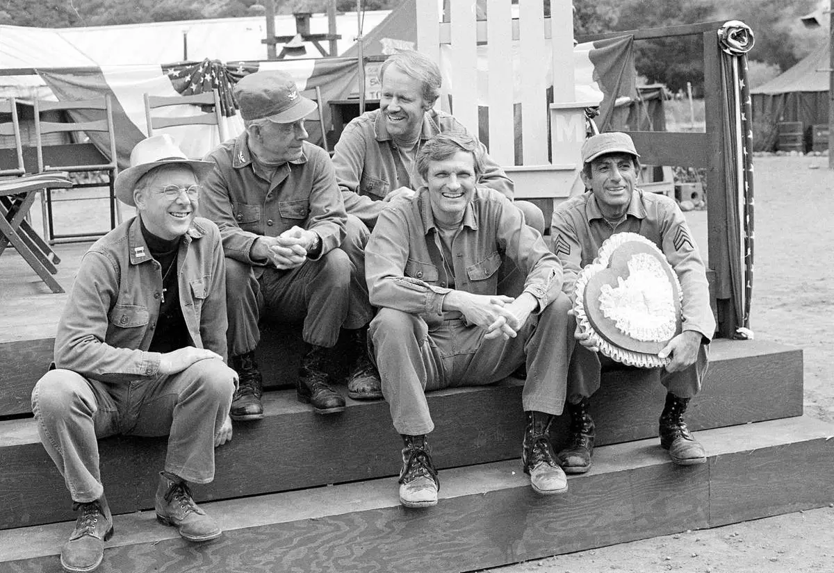 FILE - Cast members of the television series "M*A*S*H," from left, William Christopher, Harry Morgan, Mike Farrell, Alan Alda, and Jamie Farr, appear on the set during taping in Los Angeles on Sept. 15, 1982. (AP Photo/Wally Fong, File)