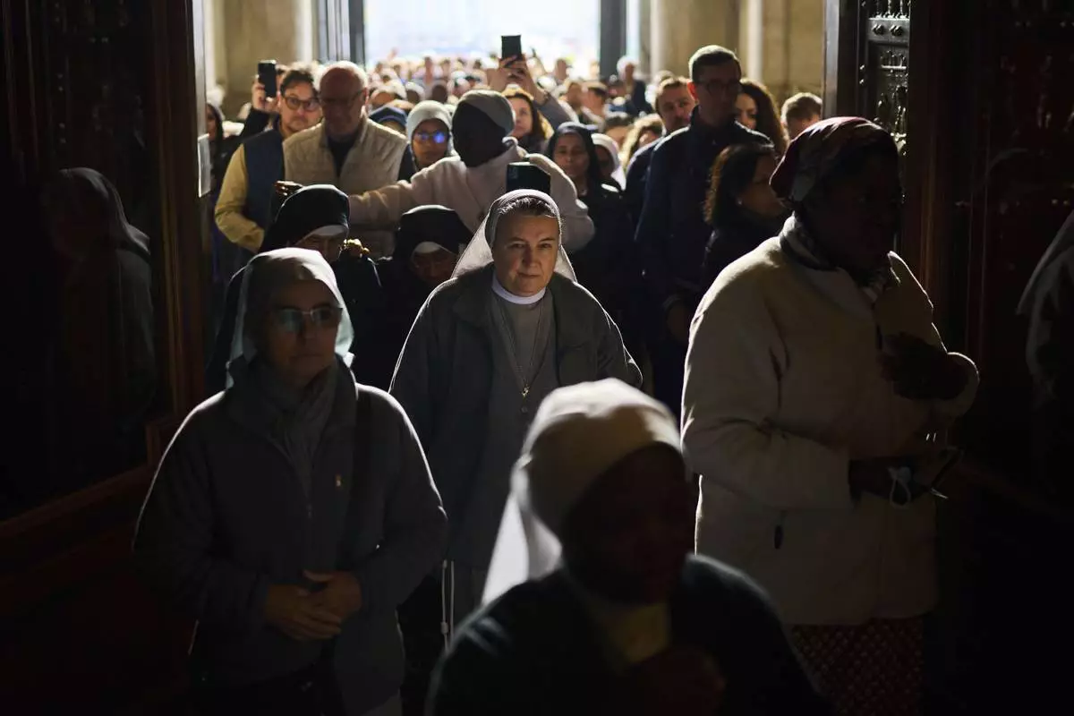 Nuns leave after entering the St. Peter's Basilica to pay their respects to Pope Francis lying in state, at the Vatican, Thursday, April 24, 2025. (AP Photo/Emilio Morenatti)