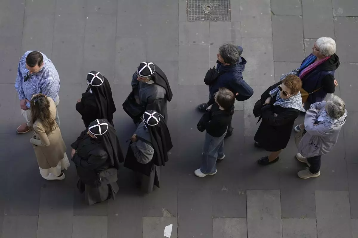 A group of four nuns, center left, wait in line with other people to view Pope Francis lying in state inside St. Peter's Basilica, at the Vatican, Thursday, April 24, 2025. (AP Photo/Markus Schreiber)