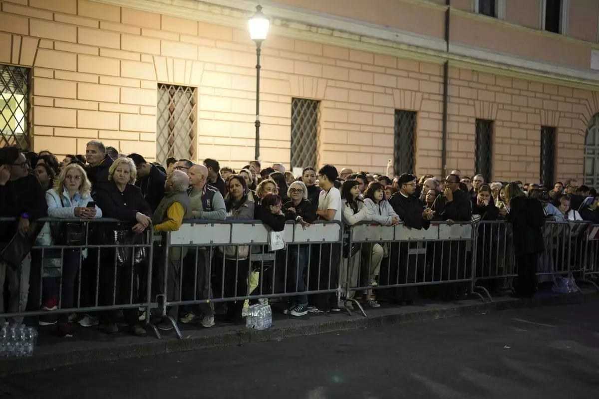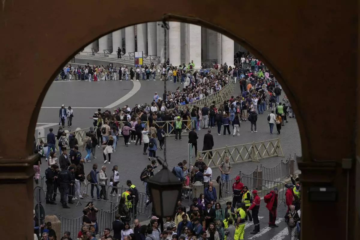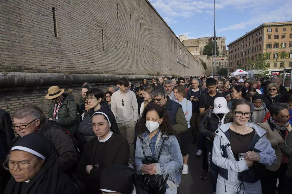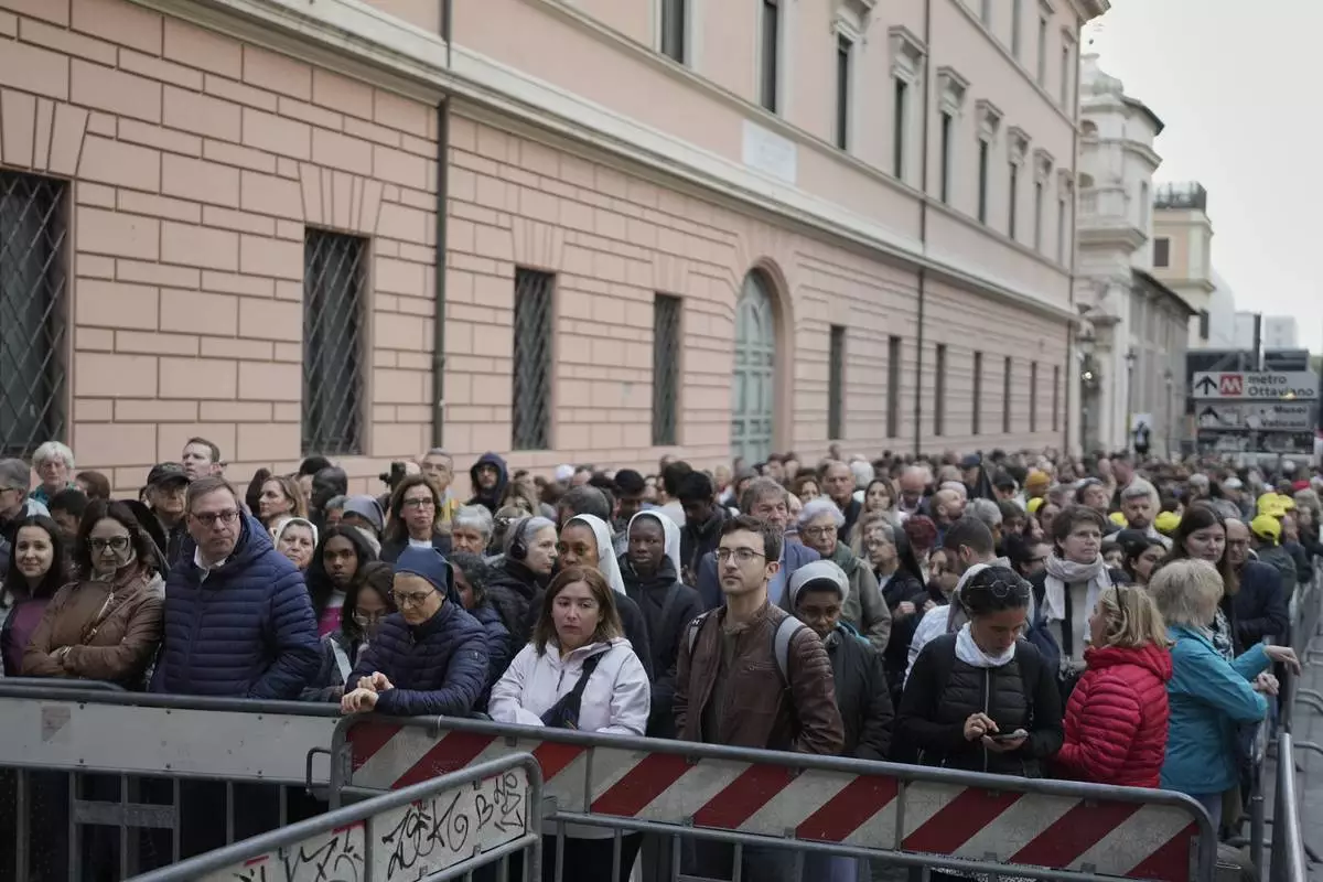 People queue to pay their respects to the late Pope Francis, who will lie in state at St. Peter's Basilica for three days, at the Vatican, Wednesday, April 23, 2025. (Cecilia Fabiano/LaPresse via AP)