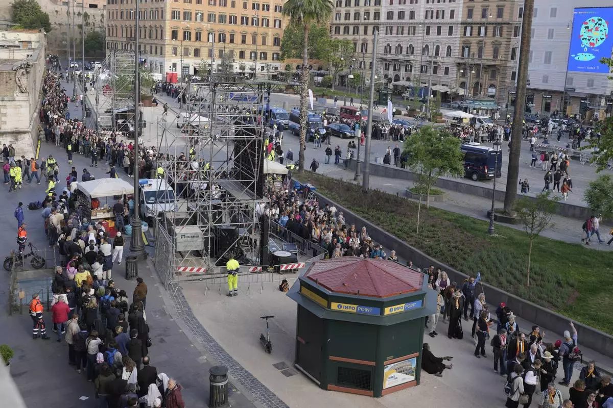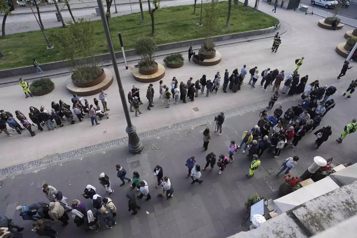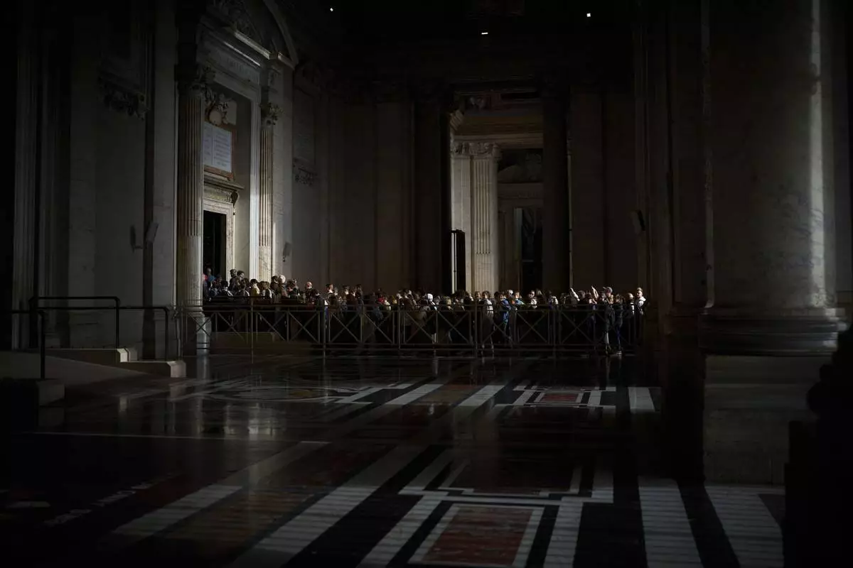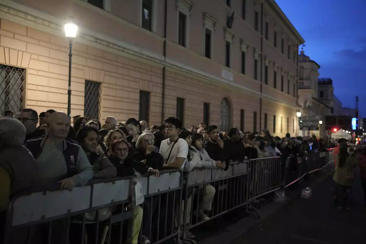 People queue to pay their respects to the late Pope Francis, who will lie in state at St. Peter's Basilica for three days, at the Vatican, Wednesday, April 23, 2025. (Cecilia Fabiano/LaPresse via AP)