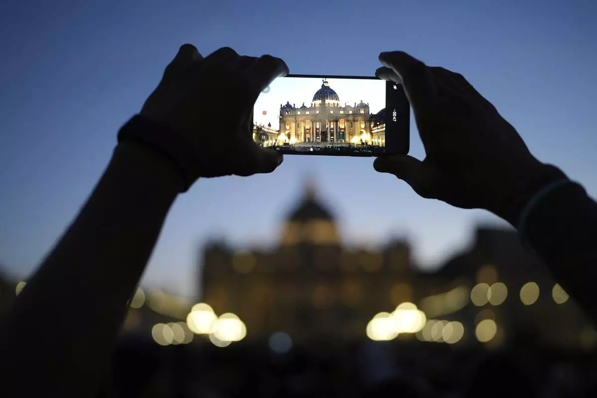 A man takes a picture of St. Peter's Basilica as faithful gather in St. Peter's Square at the Vatican, Wednesday, April 23, 2025 as the body of the late Pope Francis will lie in state inside St. Peter's Basilica for three days. (AP Photo/Markus Schreiber)